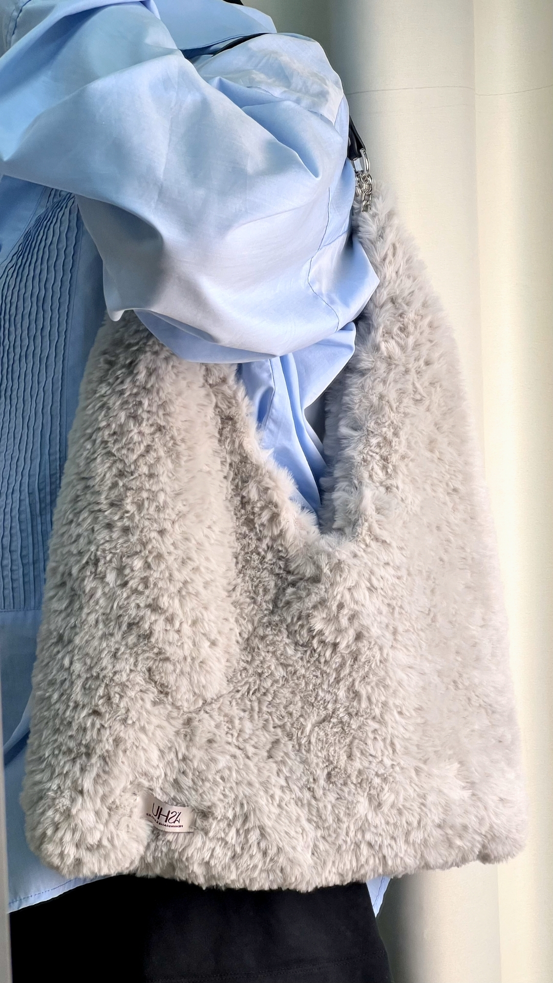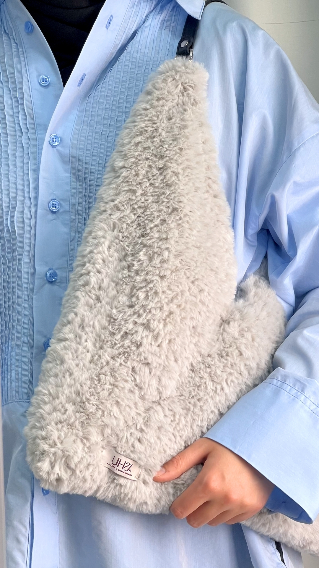 Мягкая, объёмная сумка из искусственного «меха» в тёплом светло-сером оттенке — как пушистое облако, которое хочется обнять. Форма-хобо комфортно садится на плечо, не давит и не скользит, а фактура придаёт любому образу уютный, зимний акцент — от пальто до базового тренча.