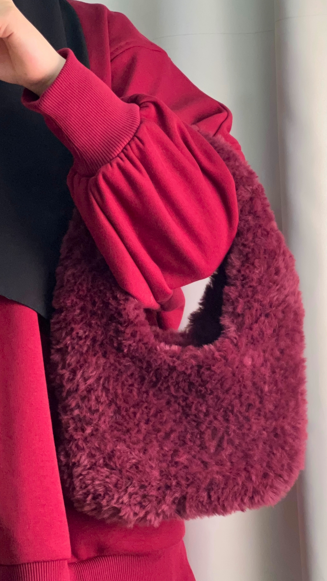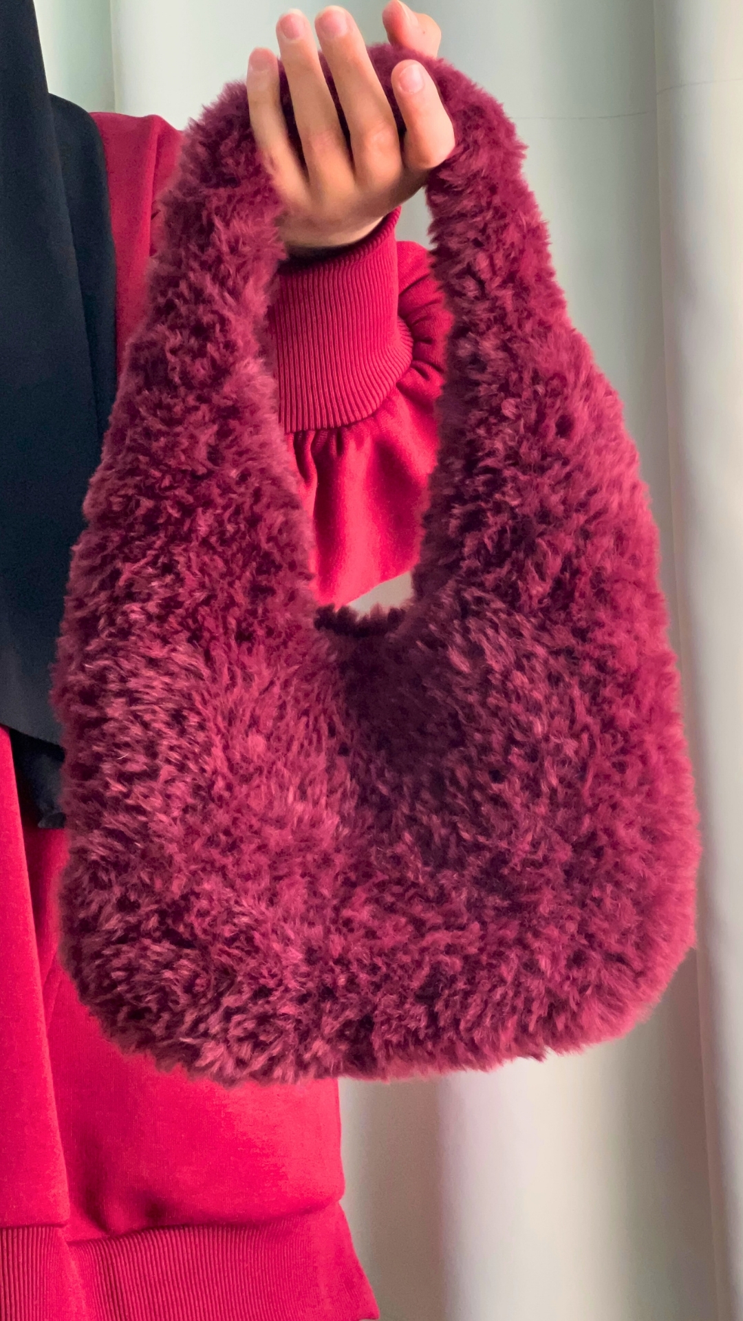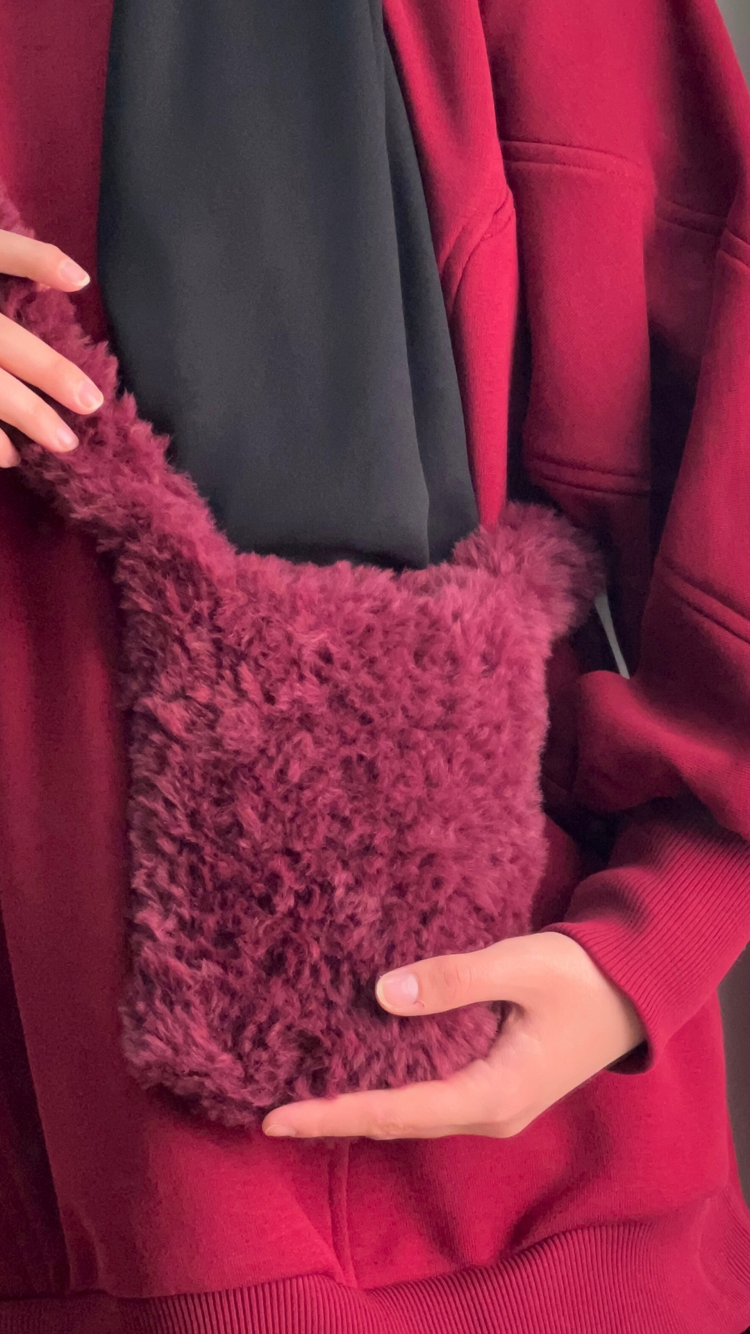 Мини-сумка из мягкого тедди в глубоким ягодном оттенке. Компактный формат — для телефона, ключей и самых нужных мелочей, когда хочется лёгкости и свободы от лишнего.