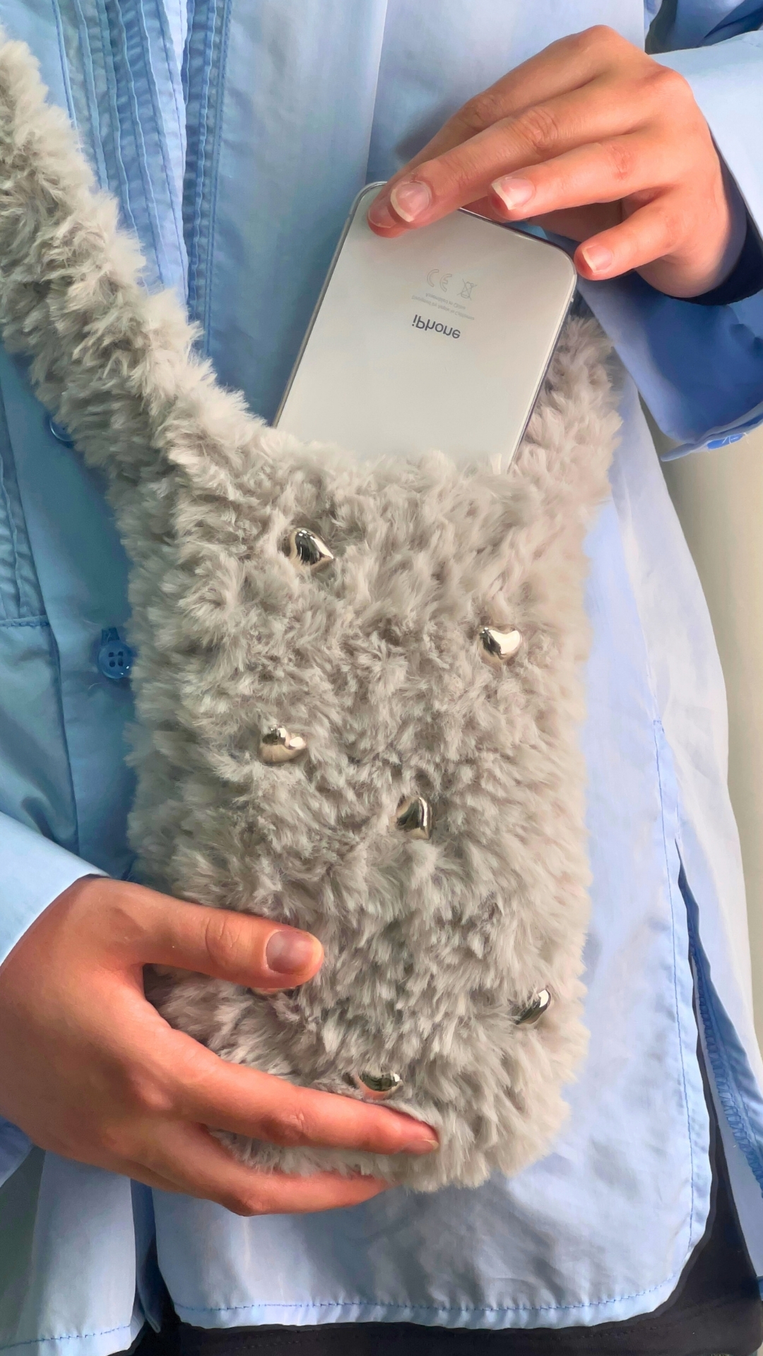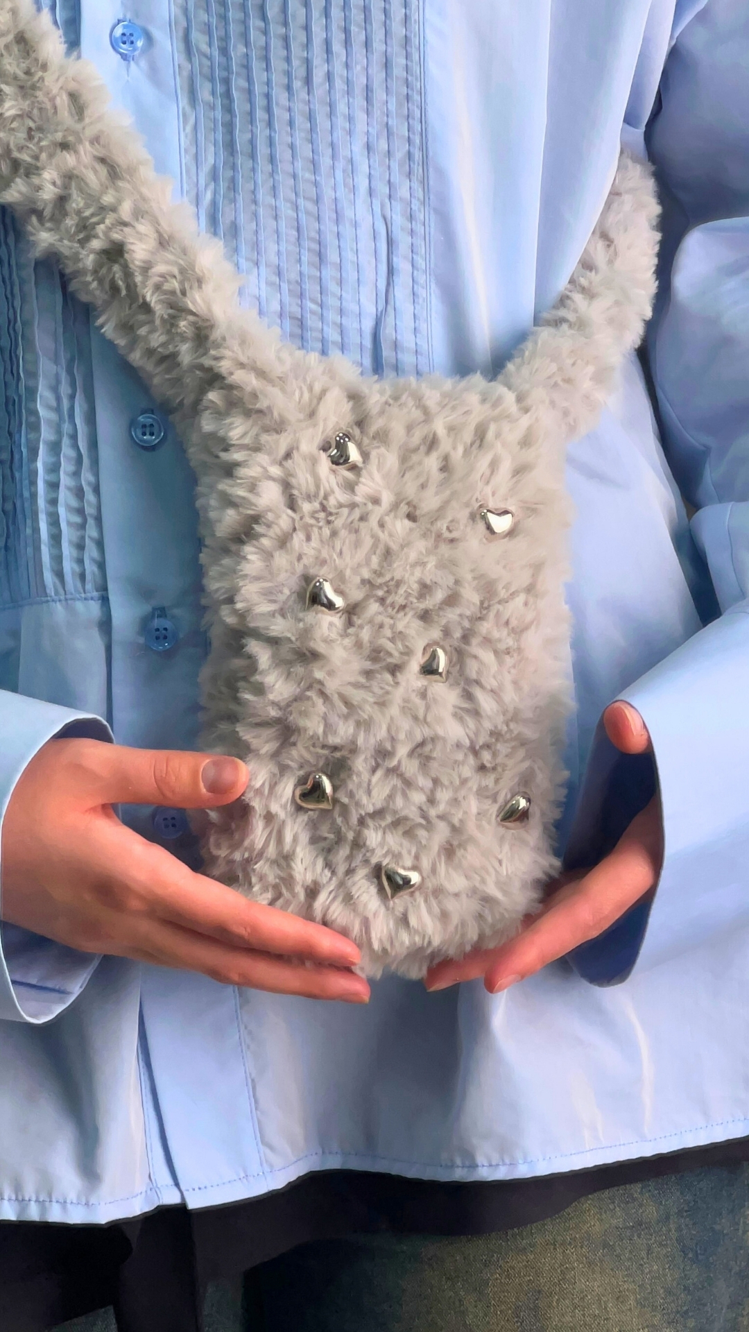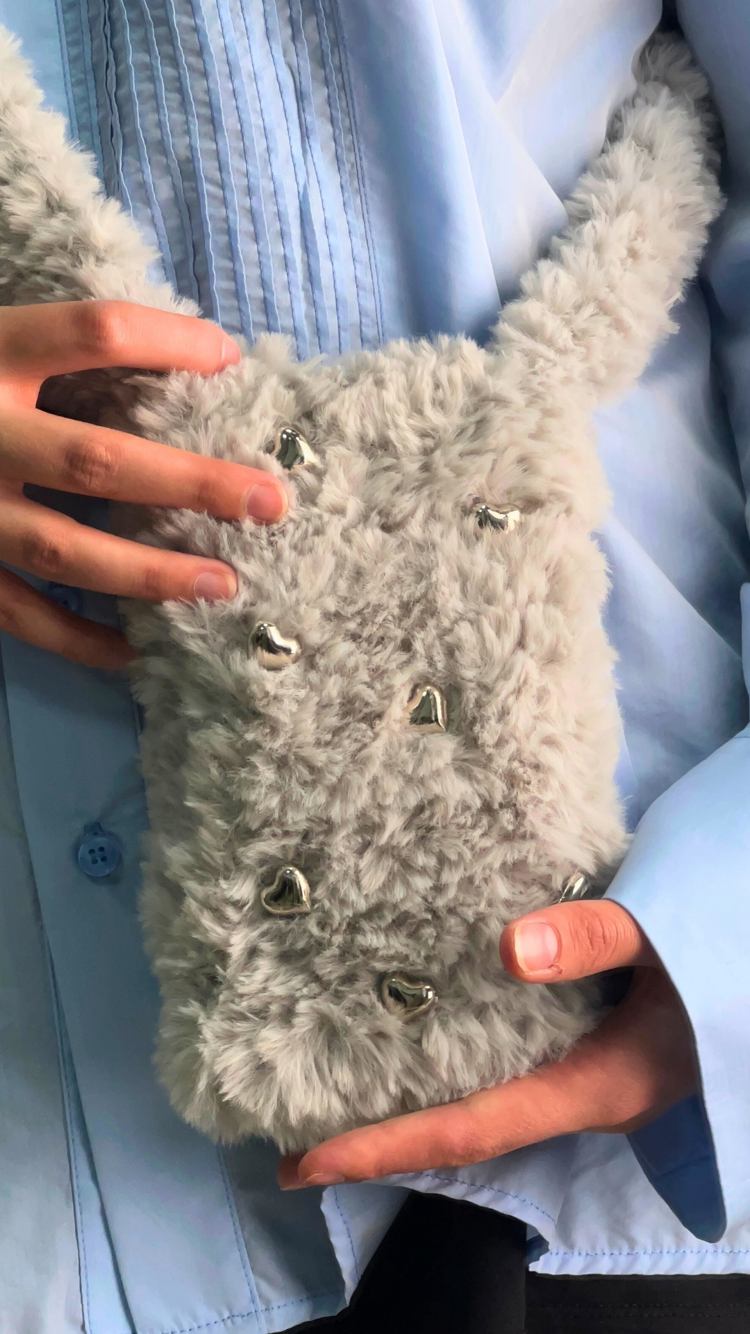 Мини-сумка из мягкого искусственного меха в дымчато-сером оттенке. Объёмная фактура и россыпь металлических сердечек создают игривый акцент, который остаётся в рамках сдержанной эстетики. Формат идеально подходит для телефона, ключей и необходимых мелочей – то, что хочется держать ближе всего. Лёгкая, тактильно комфортная и заметная в образе, она дополняет как повседневные образы с джинсами и рубашкой, так и более собранные городские сочетания. Ручная работа. В единственном экземпляре.