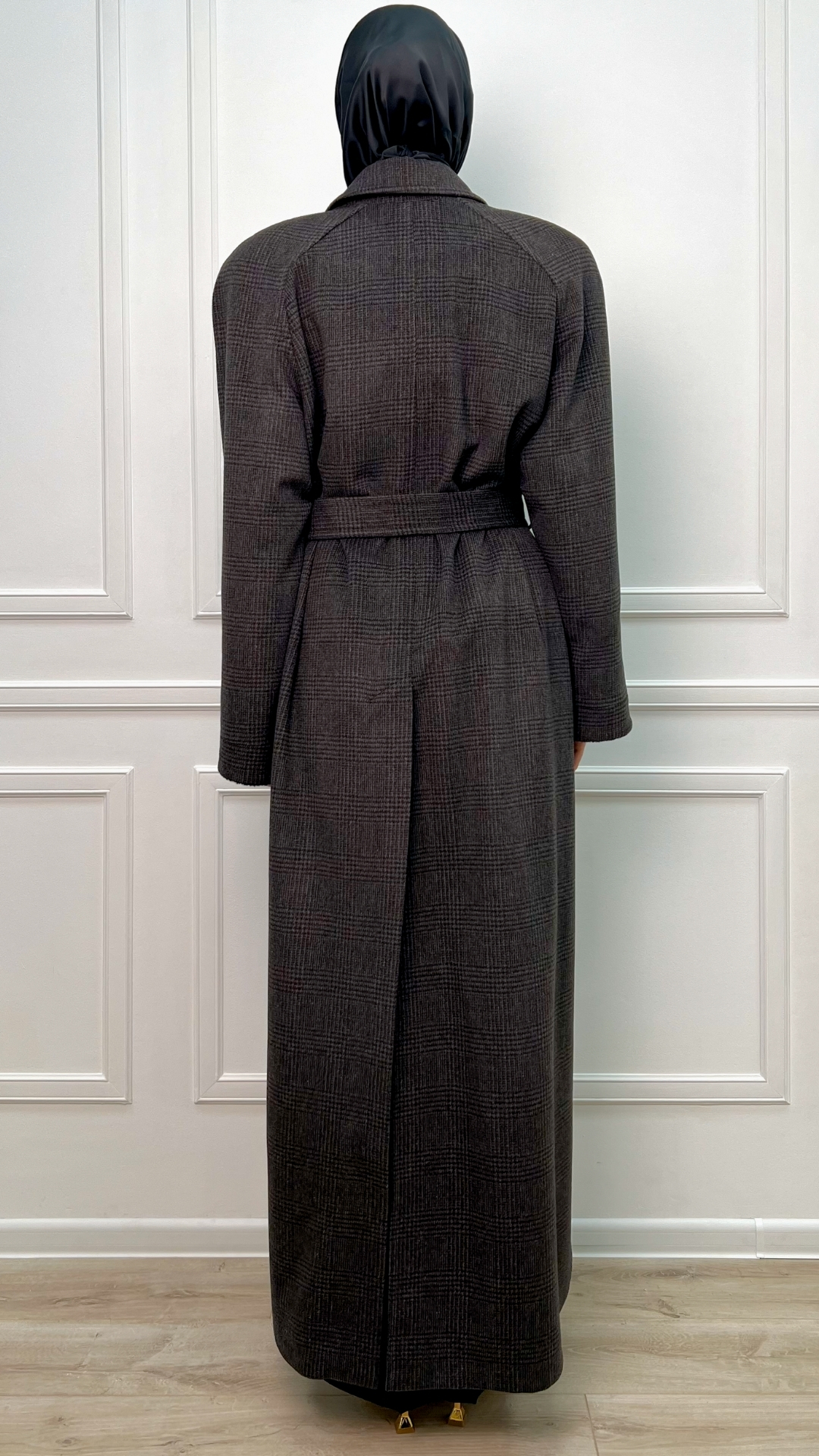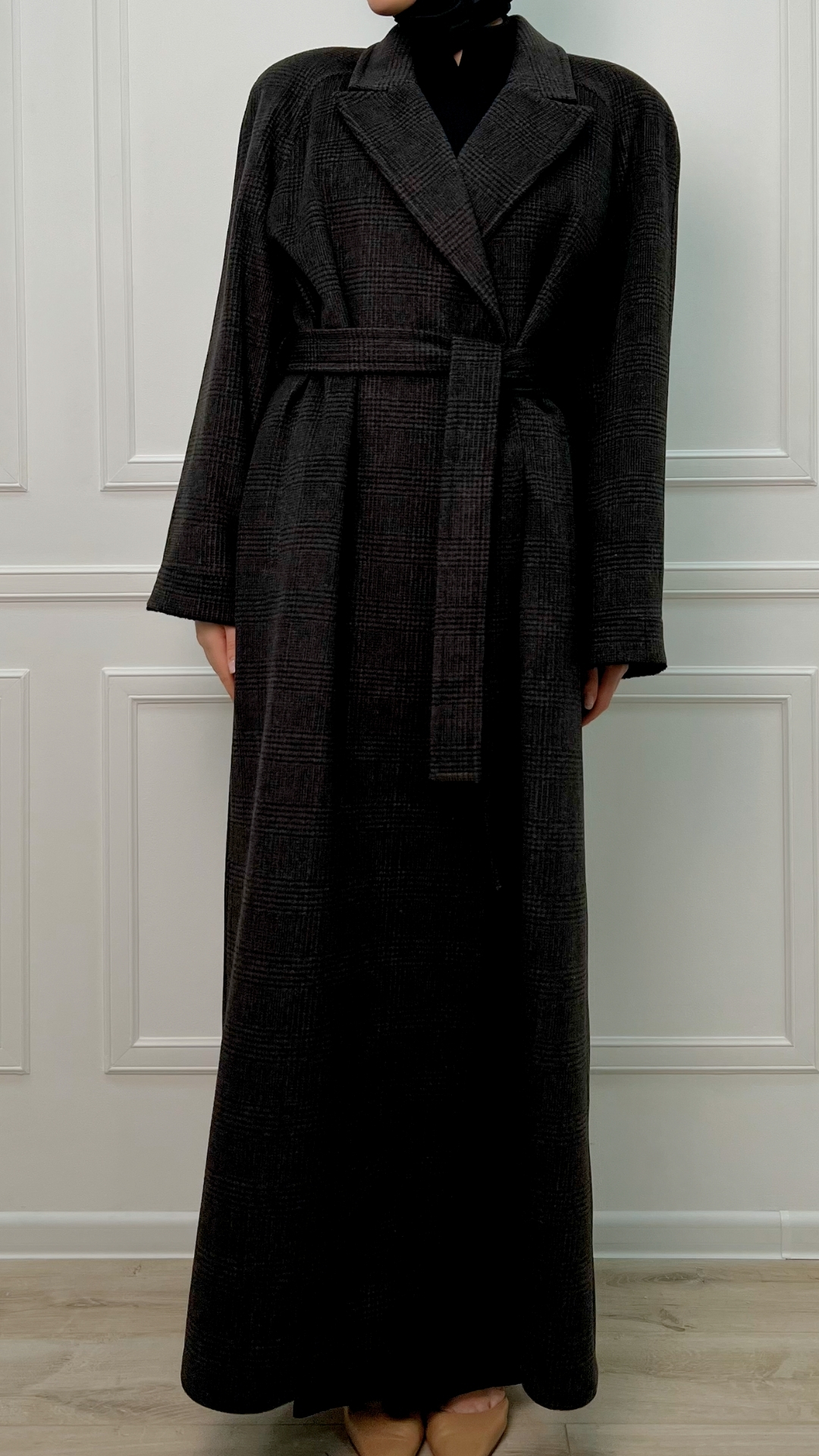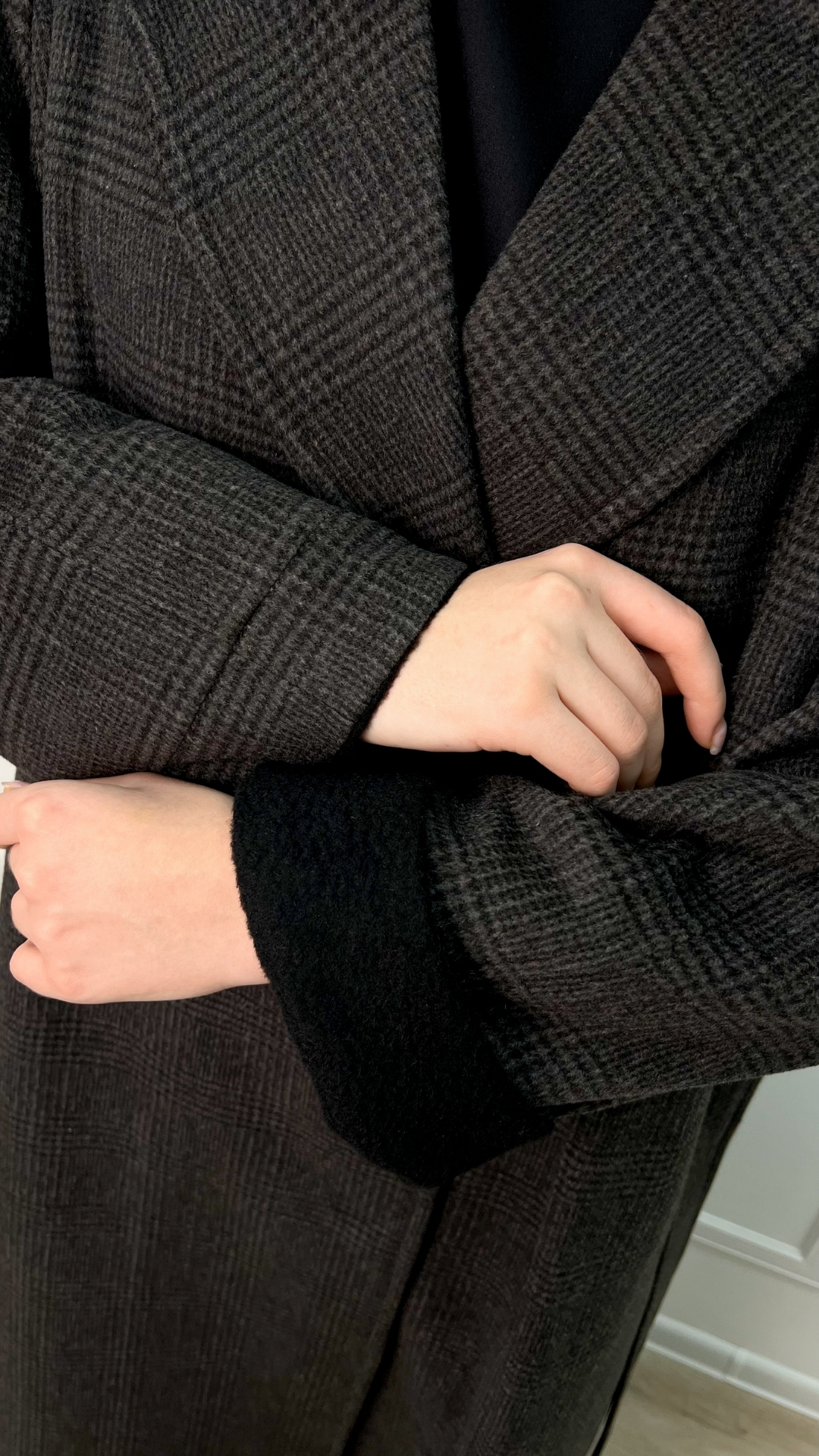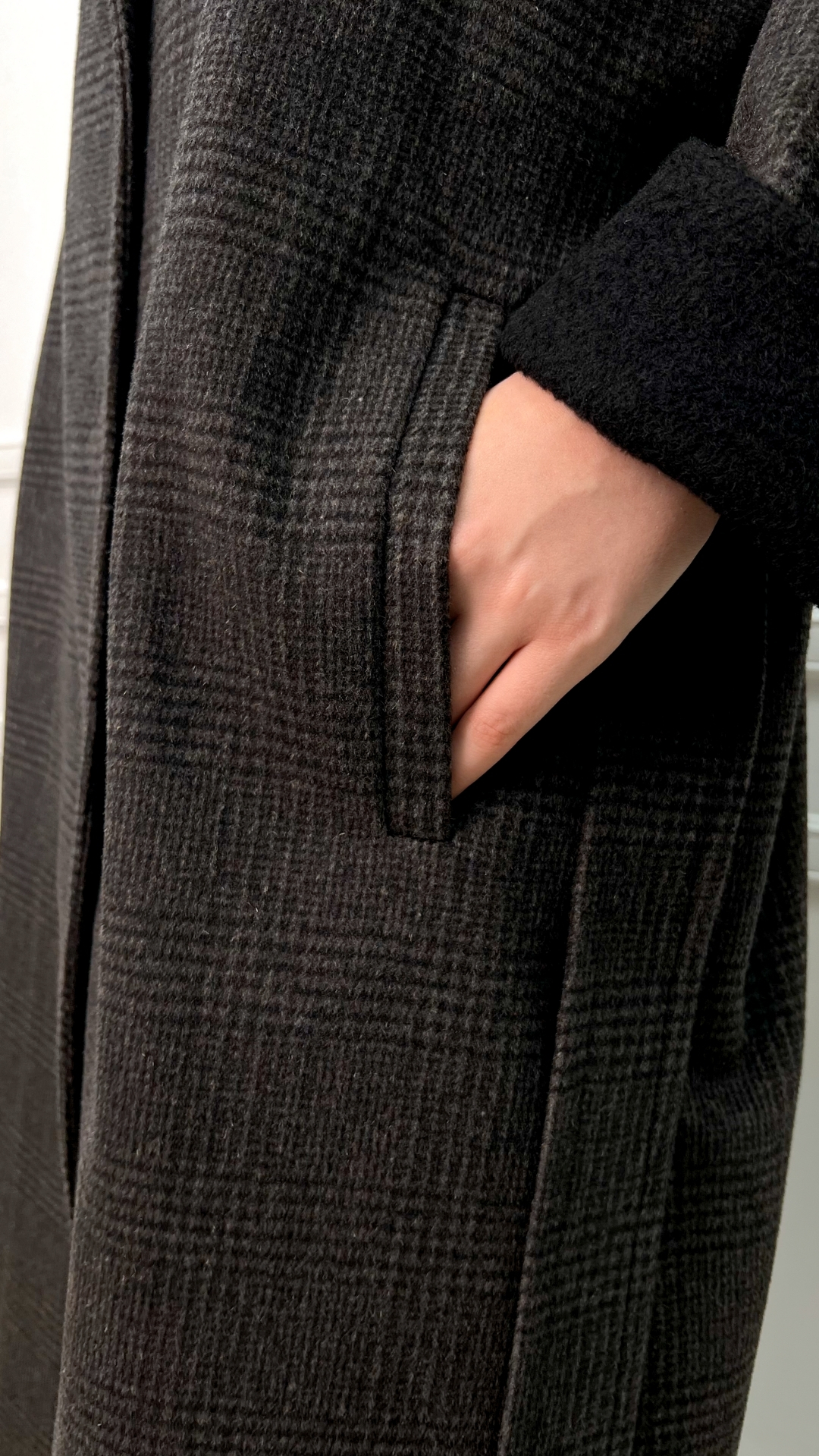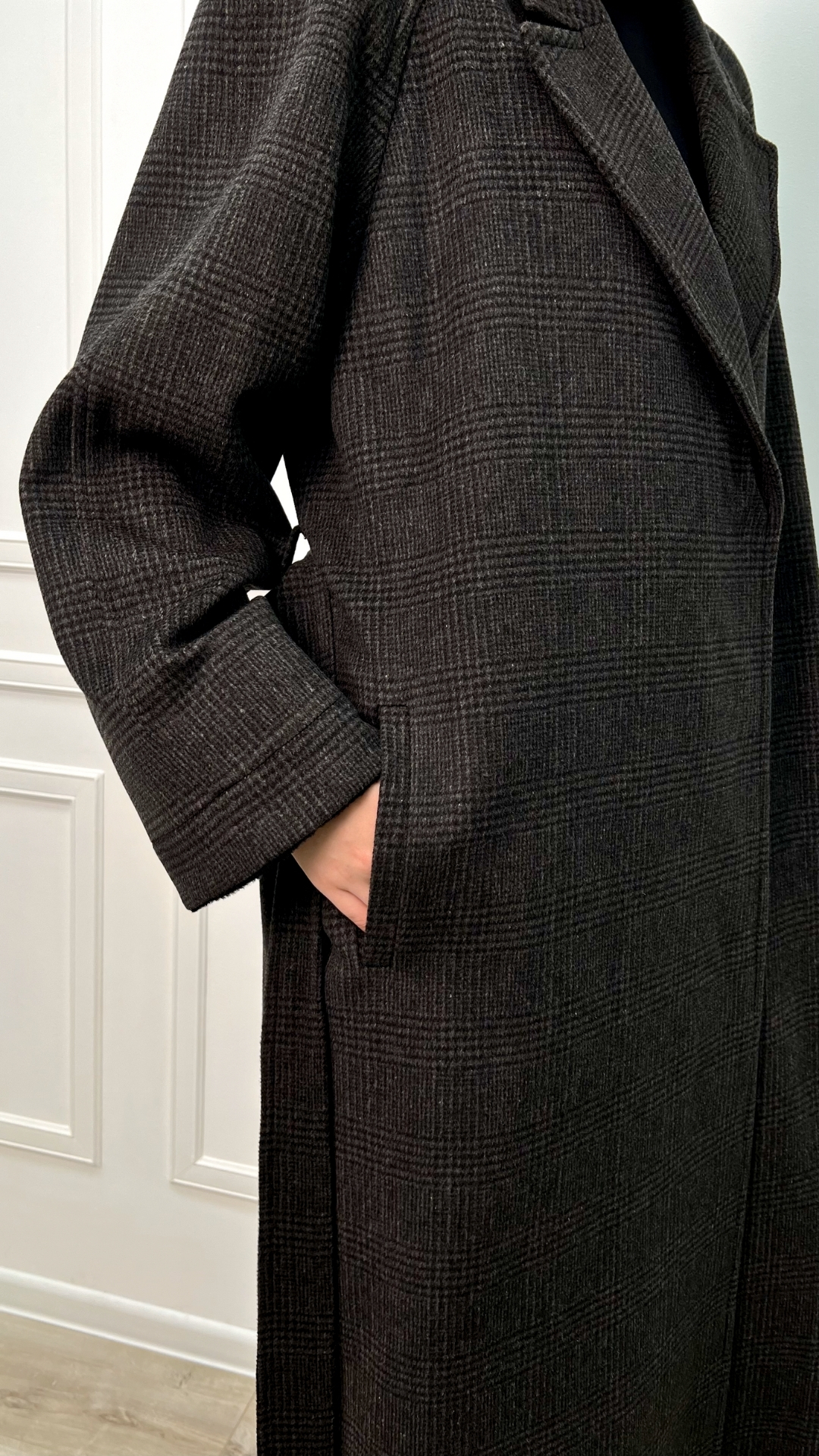 Пальто из шерсти с кашемиром цвета горького шоколада — тёплая версия quiet luxury на каждый день. Длинный силуэт мягко вытягивает фигуру, пояс собирает линию талии, а спокойная клетка читаетcя только вблизи, не перегружая образ.