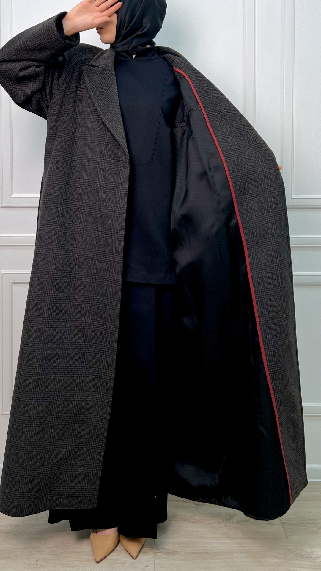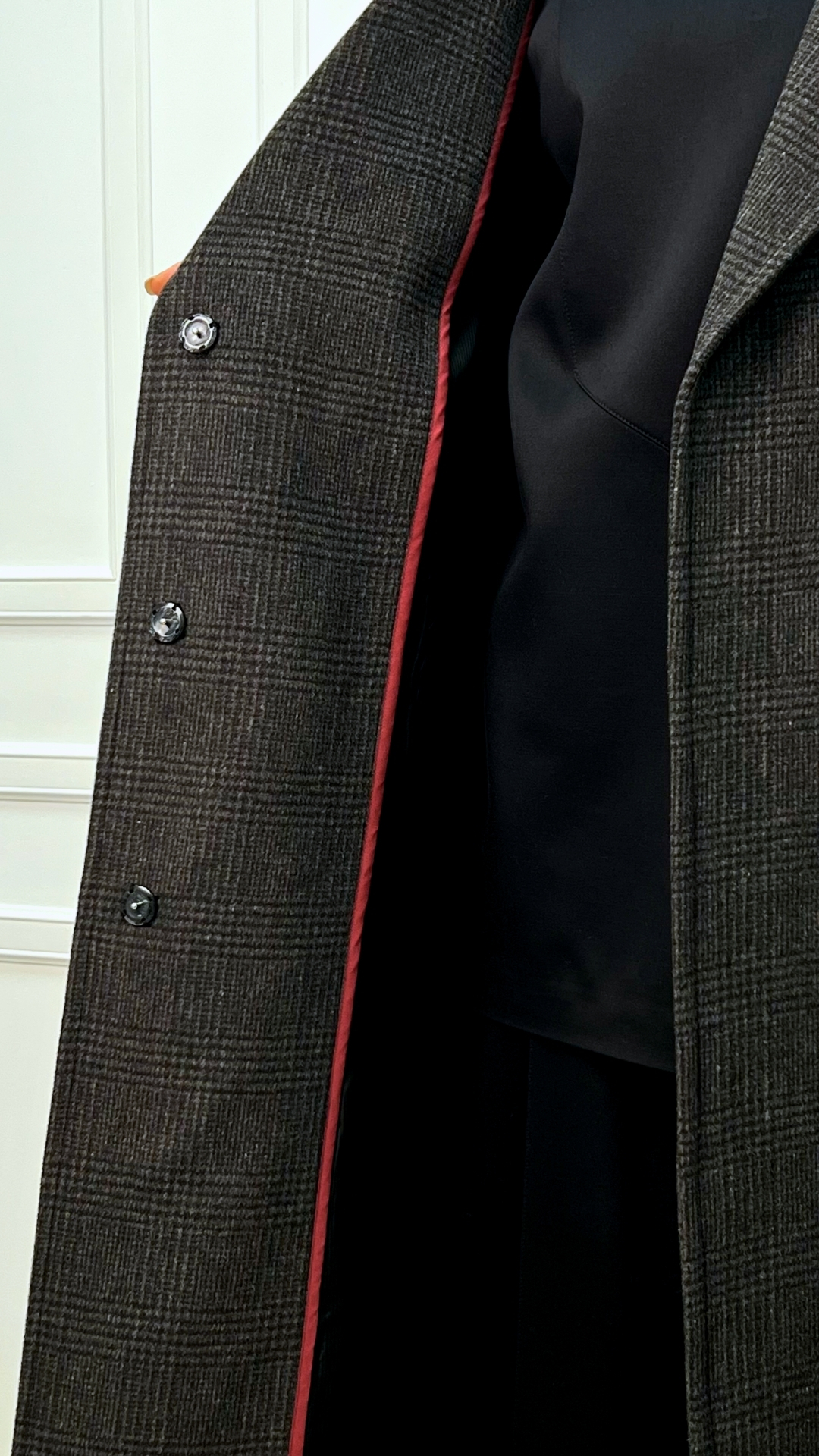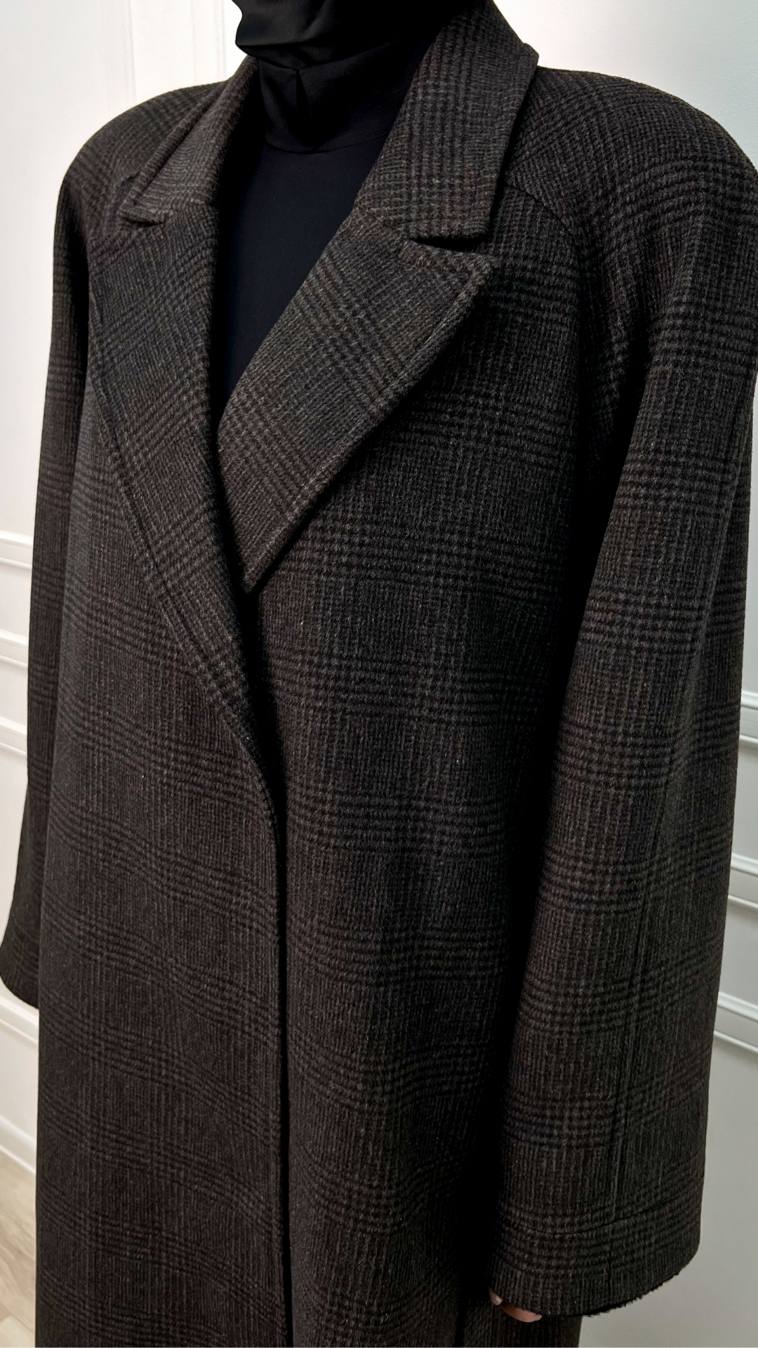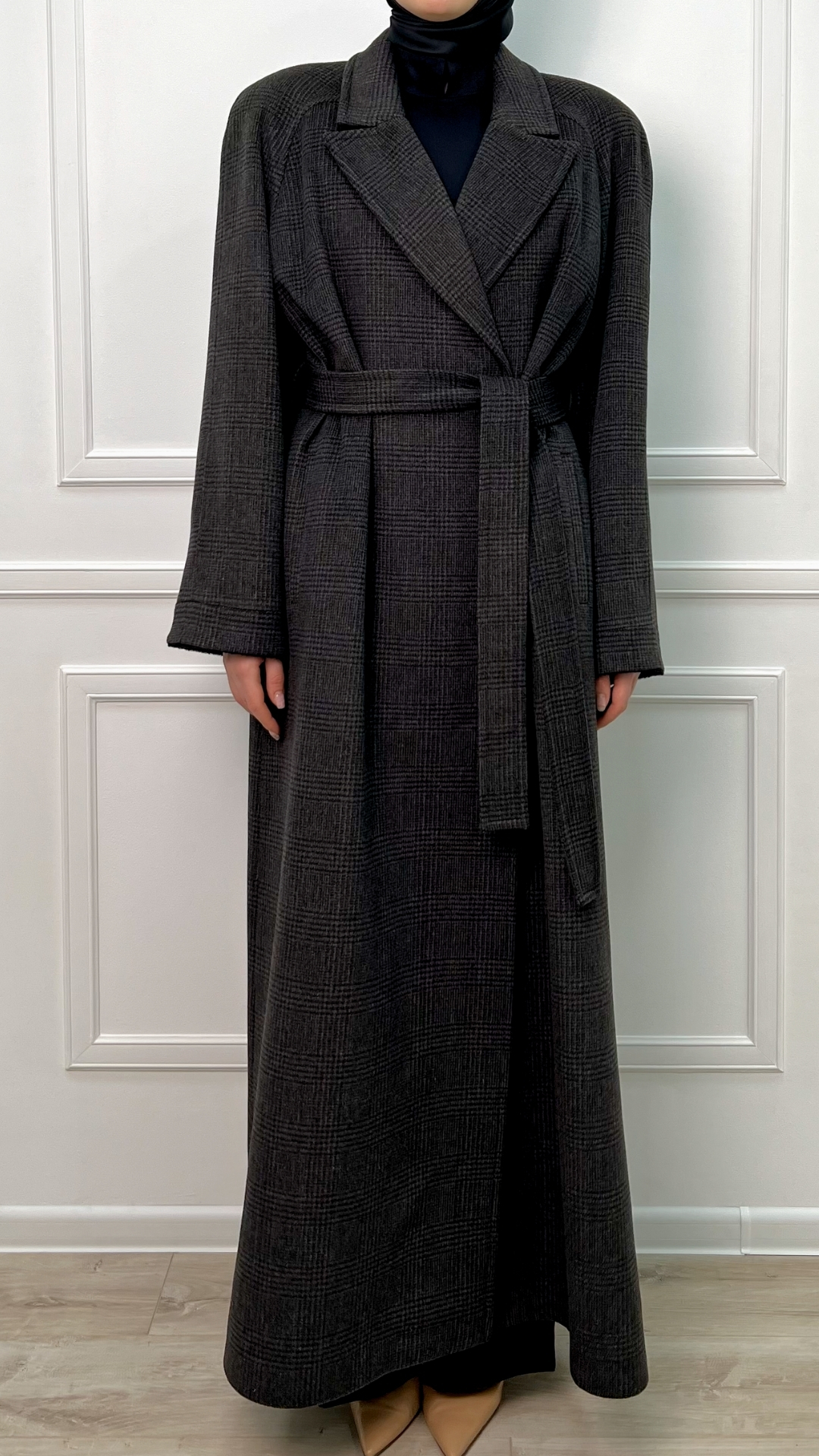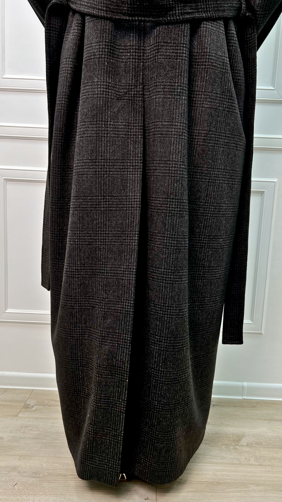 Пальто из шерсти с кашемиром цвета горького шоколада — тёплая версия quiet luxury на каждый день. Длинный силуэт мягко вытягивает фигуру, пояс собирает линию талии, а спокойная клетка читаетcя только вблизи, не перегружая образ.