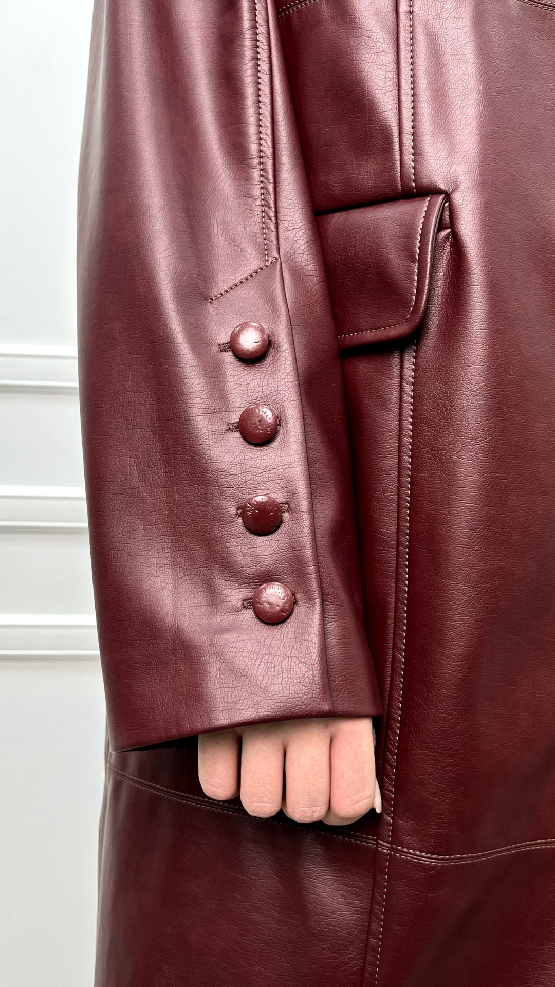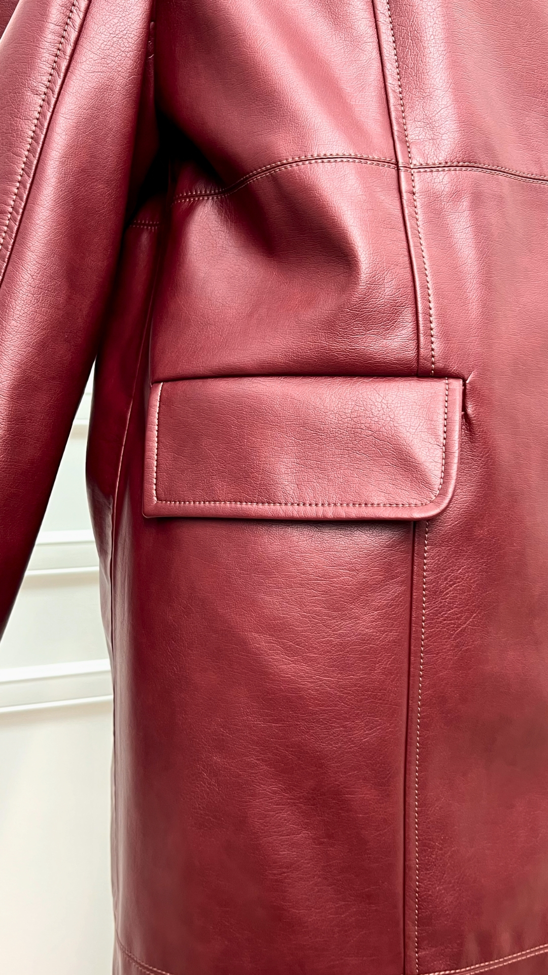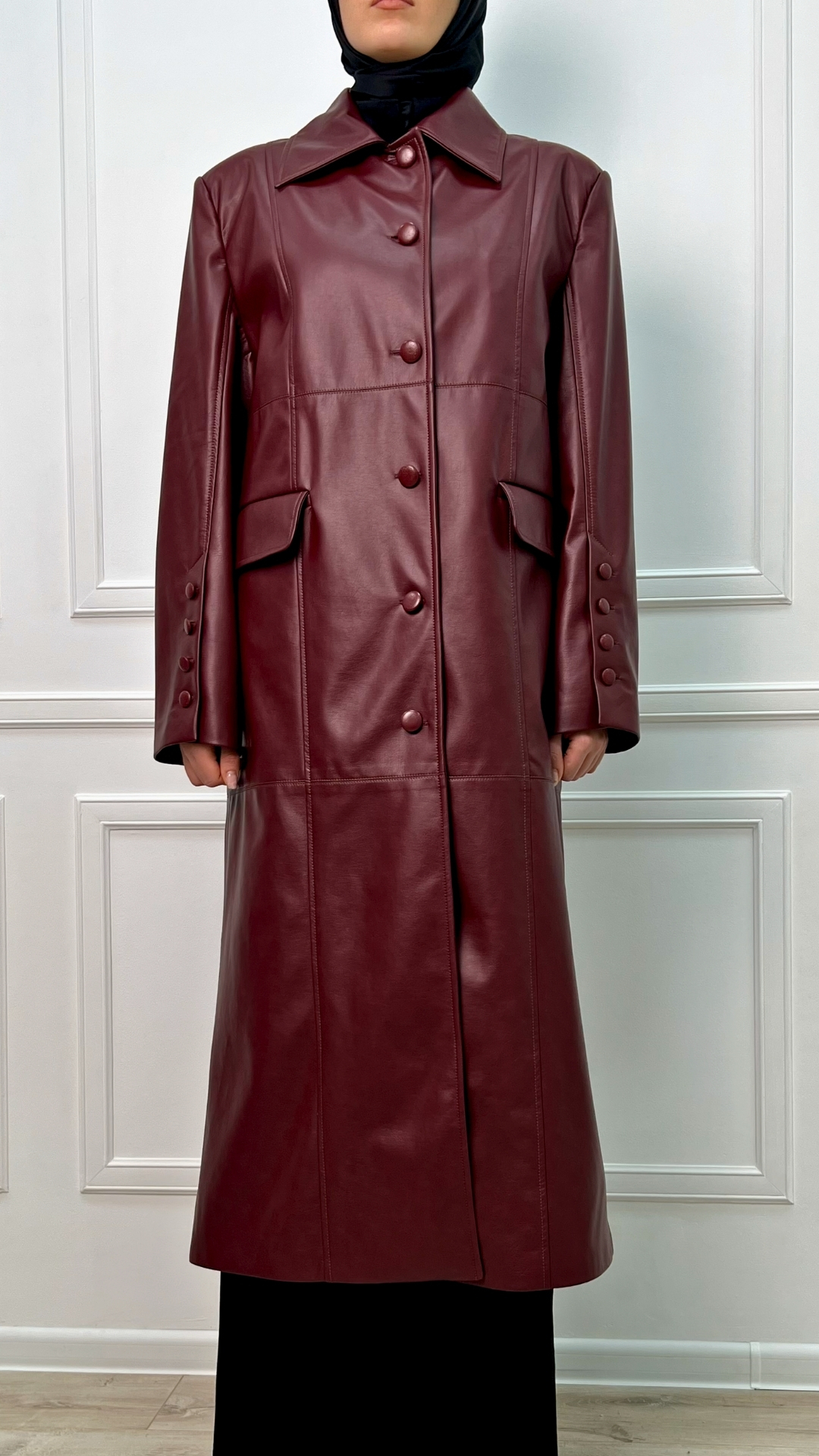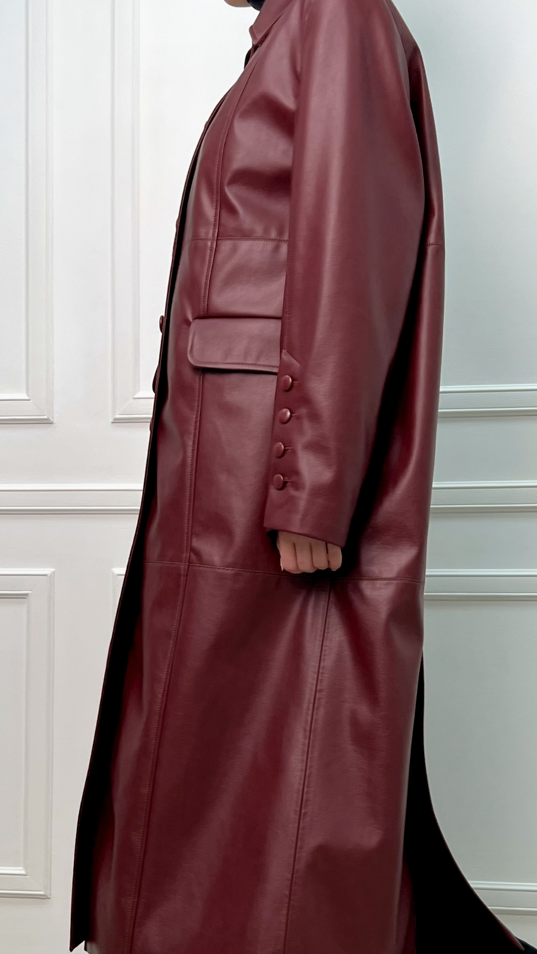 Кожаный плащ цвета спелого бордо — сдержанная драма в эстетике quiet luxury. Гладкая кожа мягко обтекает силуэт, длина ниже колена вытягивает фигуру, а чистая вертикаль застёжки делает образ собранным и графичным.