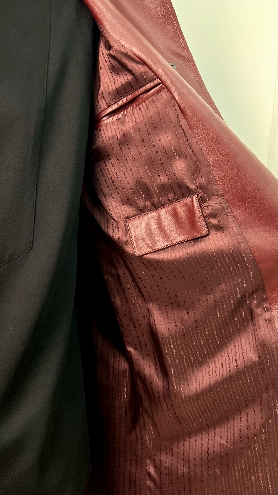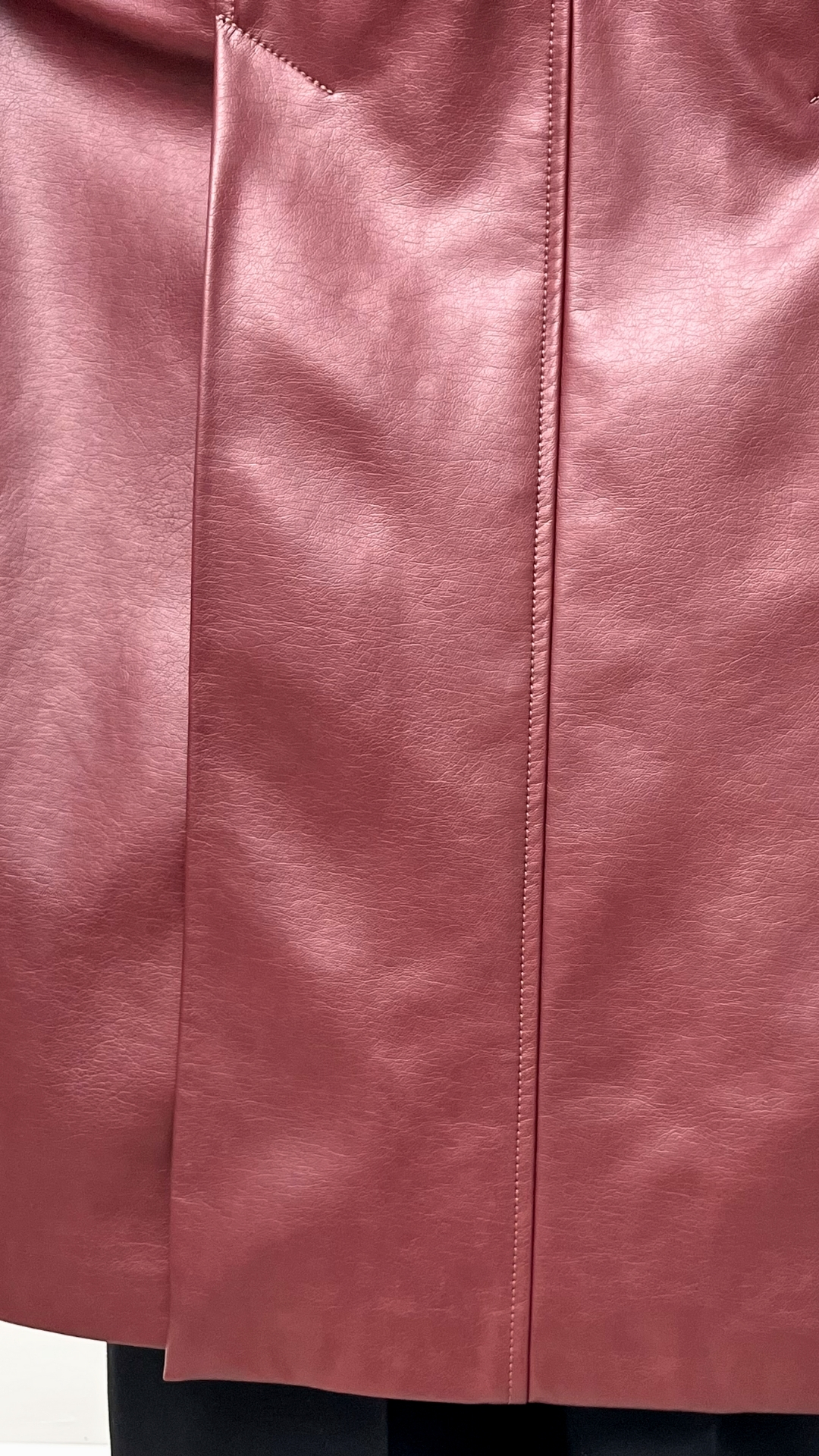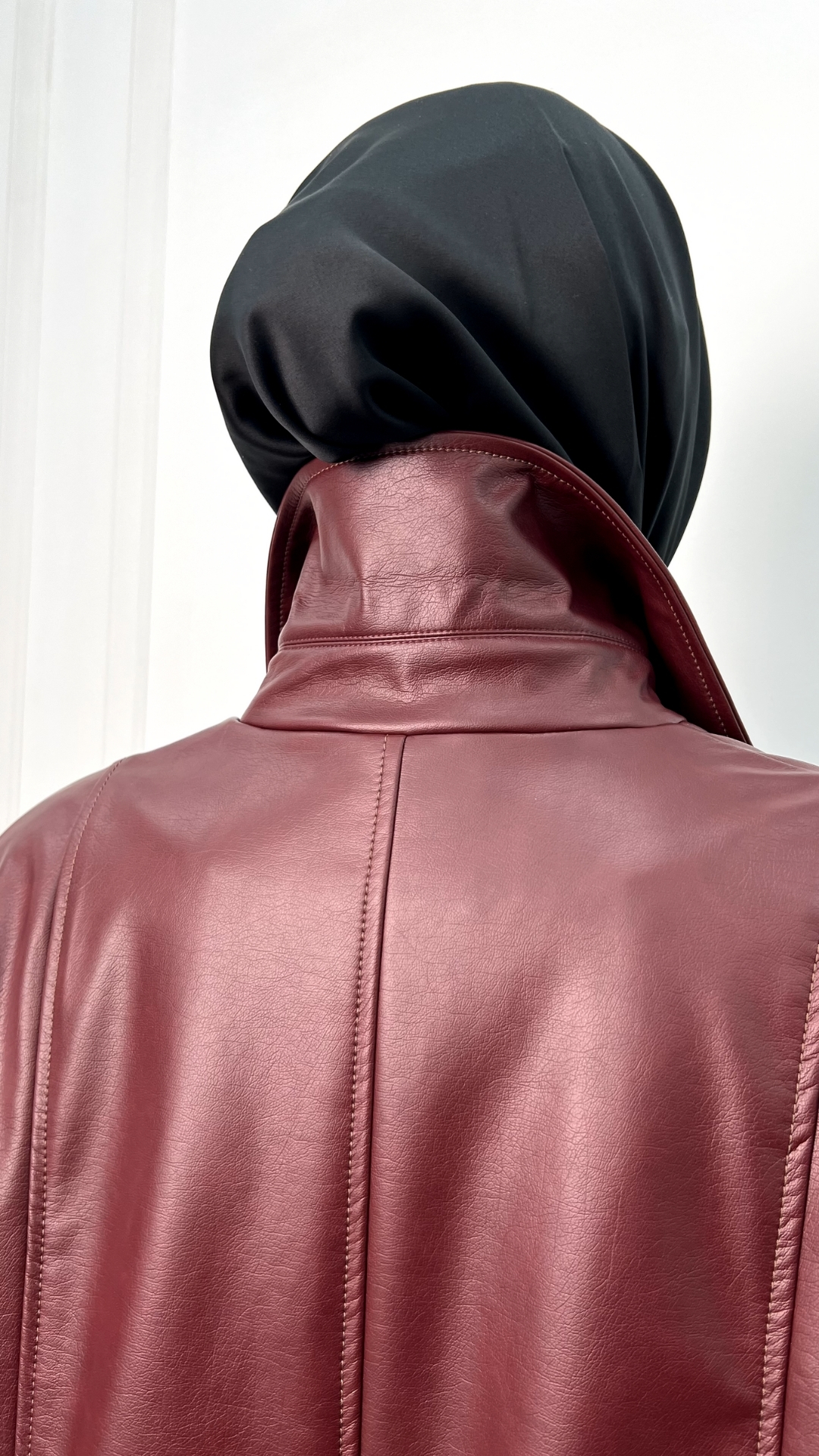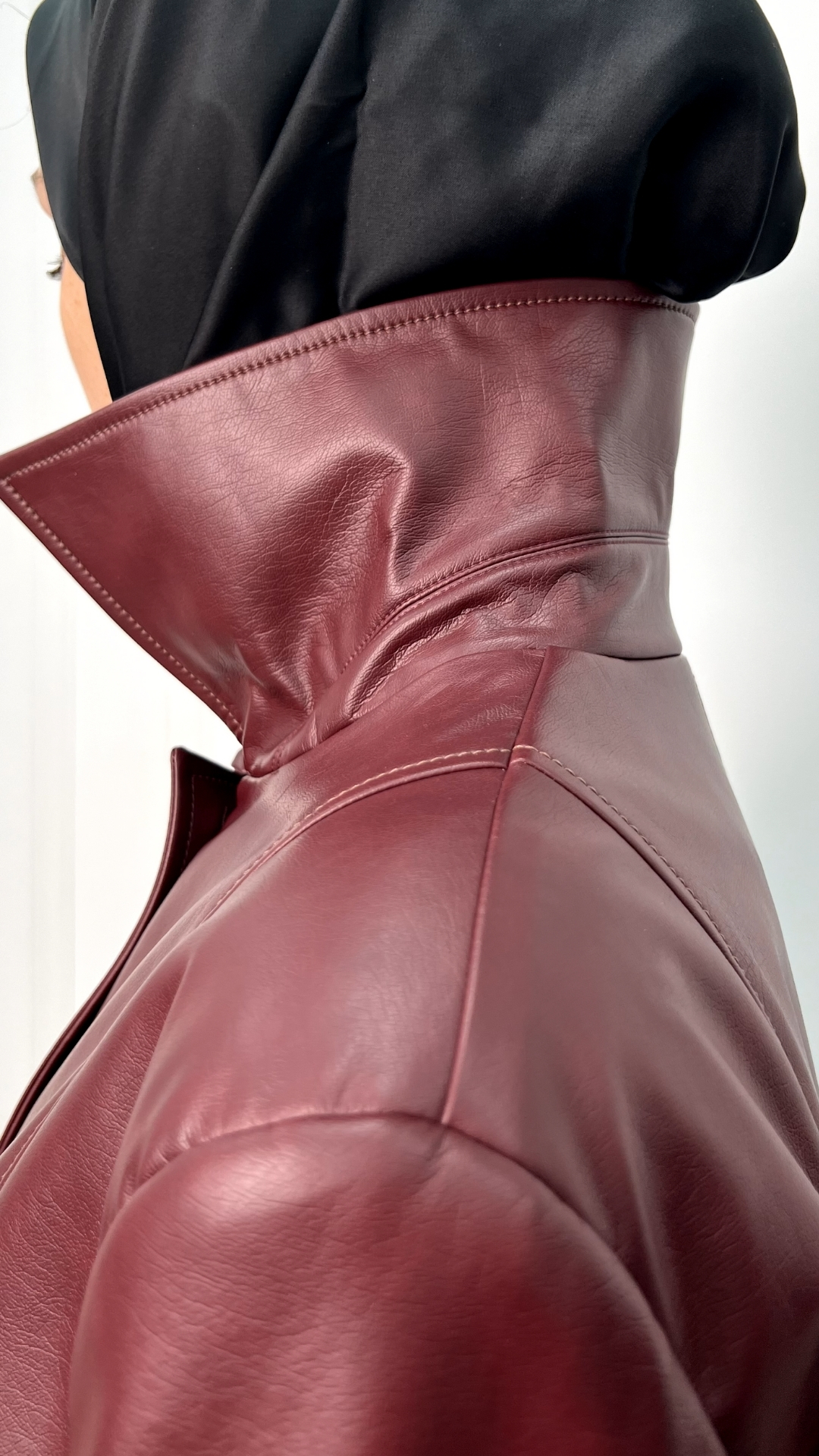 Кожаный плащ цвета спелого бордо — сдержанная драма в эстетике quiet luxury. Гладкая кожа мягко обтекает силуэт, длина ниже колена вытягивает фигуру, а чистая вертикаль застёжки делает образ собранным и графичным.