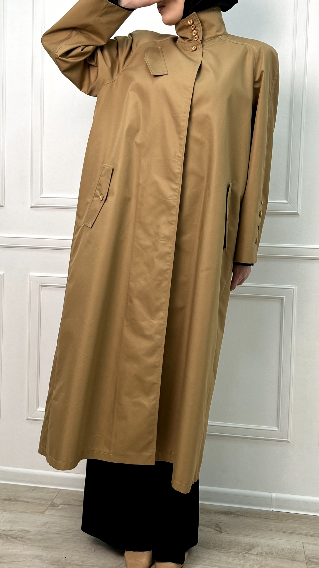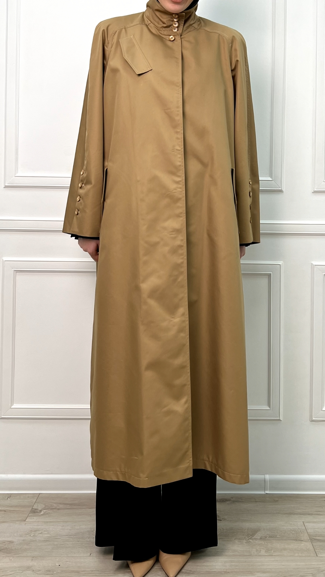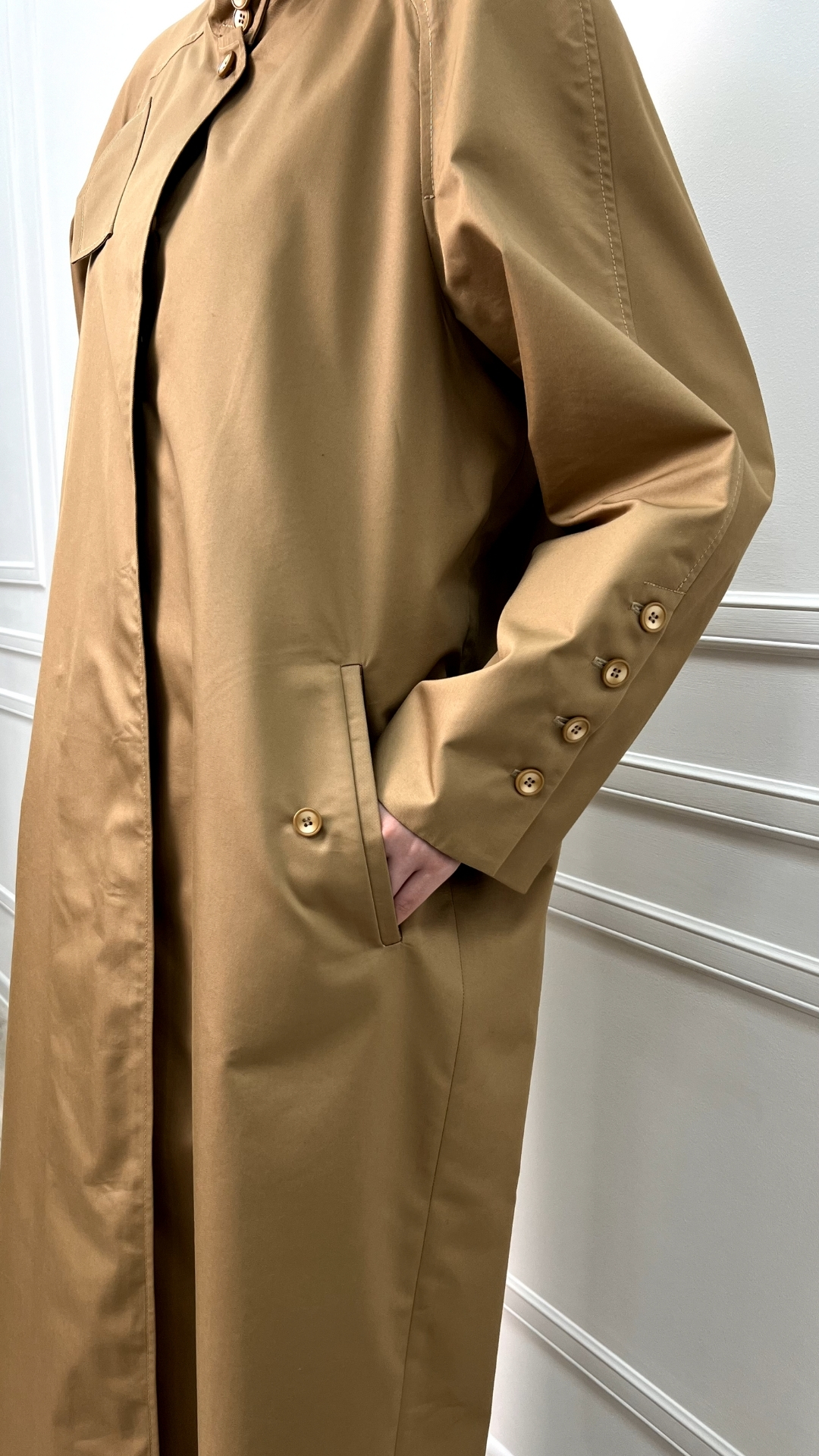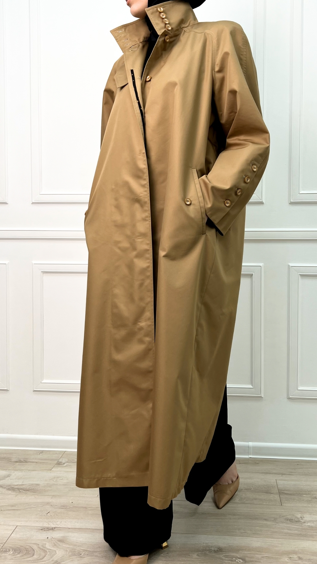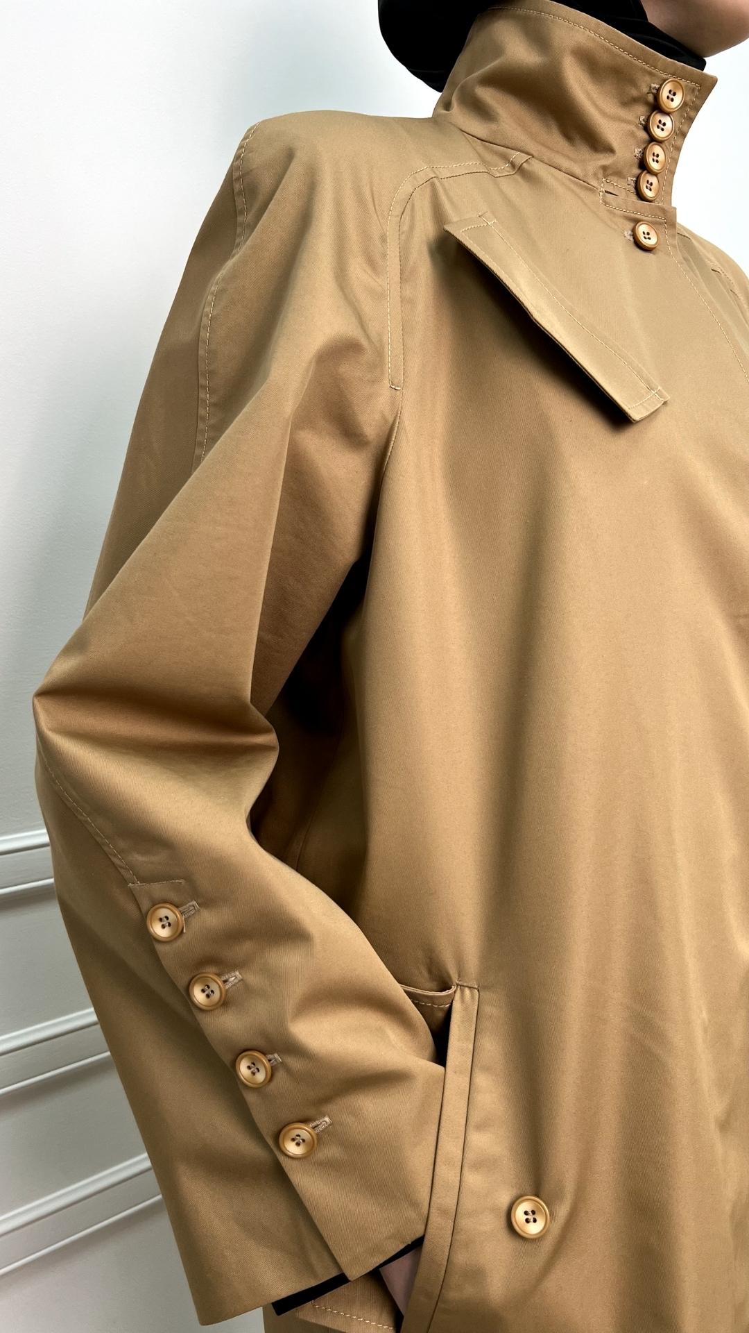 Тренч из плотной тренчевой ткани в классическом бежевом оттенке — как продуманная «броня» на каждый день. Длинный силуэт вытягивает фигуру, скрытая застёжка оставляет линию чистой, а высокий ворот и ряд пуговиц защищают от ветра и выглядят графично и собранно.