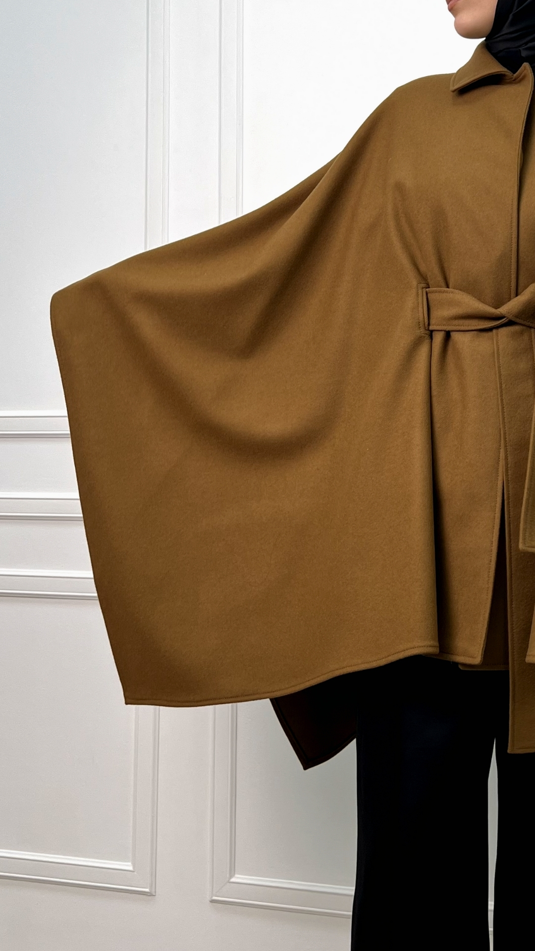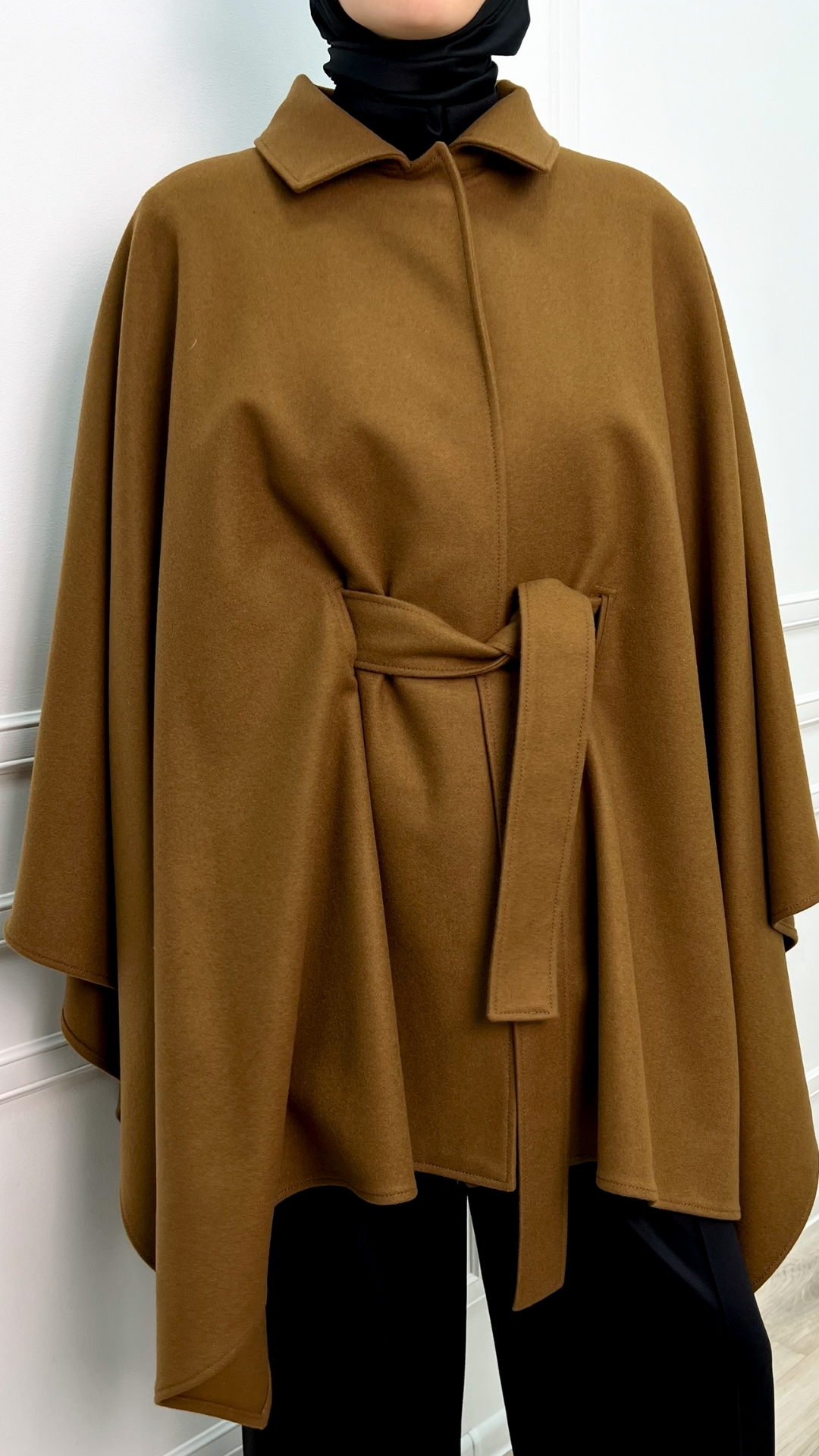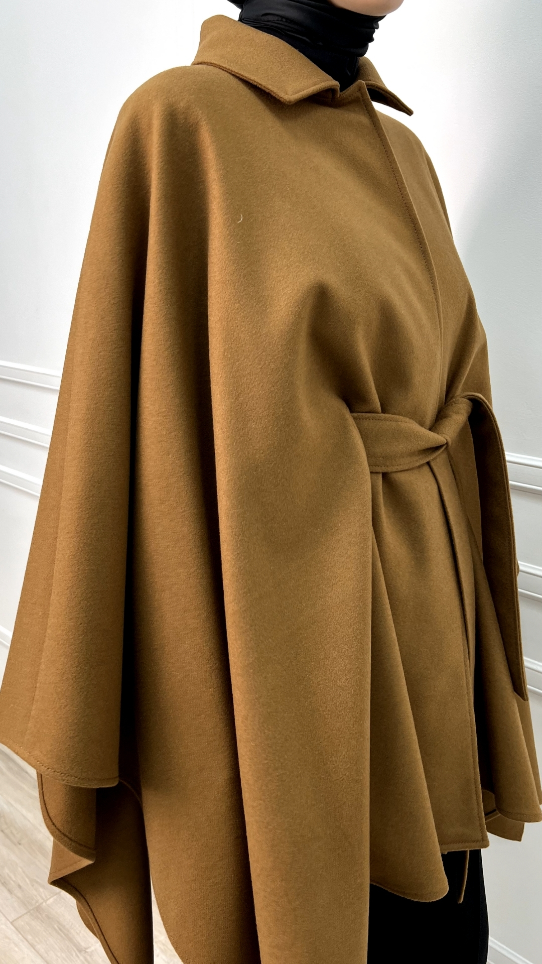 Пончо из шерсти в тёплом карамельном оттенке — как мягкое одеяло, которое можно носить в городе. Свободный силуэт красиво струится и создаёт эффект «крыльев», а пояс собирает объём и формирует аккуратную талию.