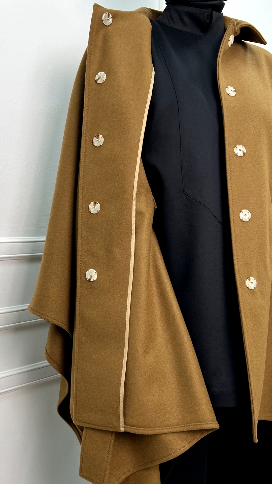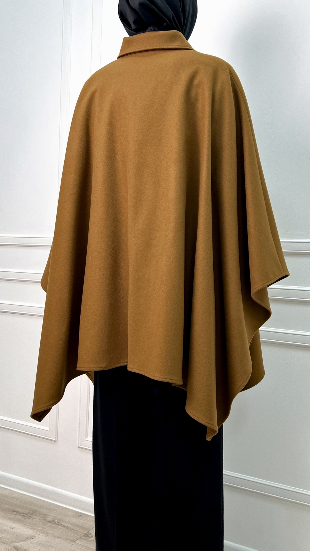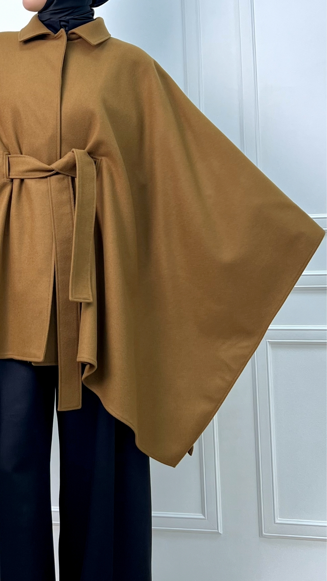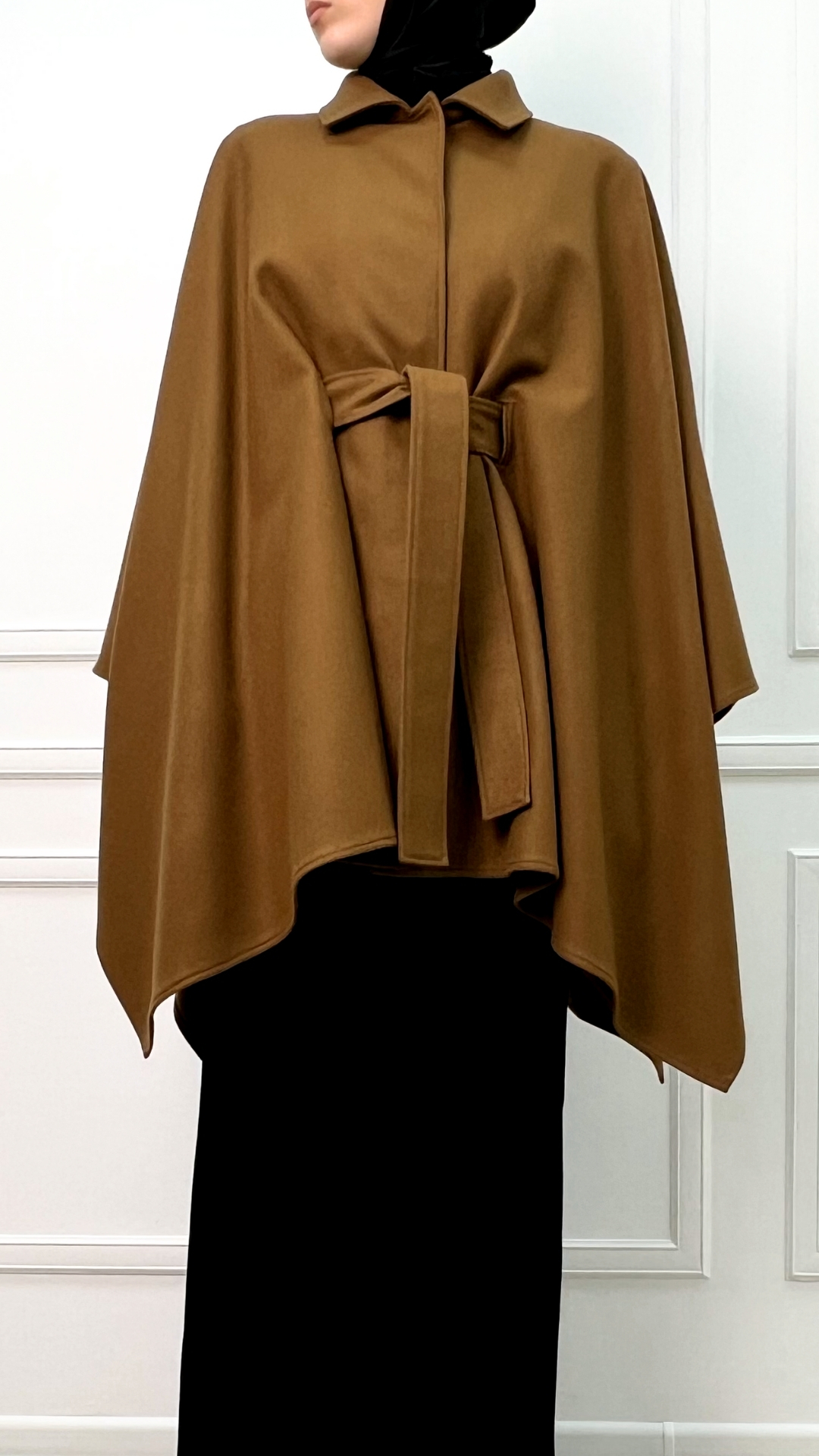 Пончо из шерсти в тёплом карамельном оттенке — как мягкое одеяло, которое можно носить в городе. Свободный силуэт красиво струится и создаёт эффект «крыльев», а пояс собирает объём и формирует аккуратную талию.