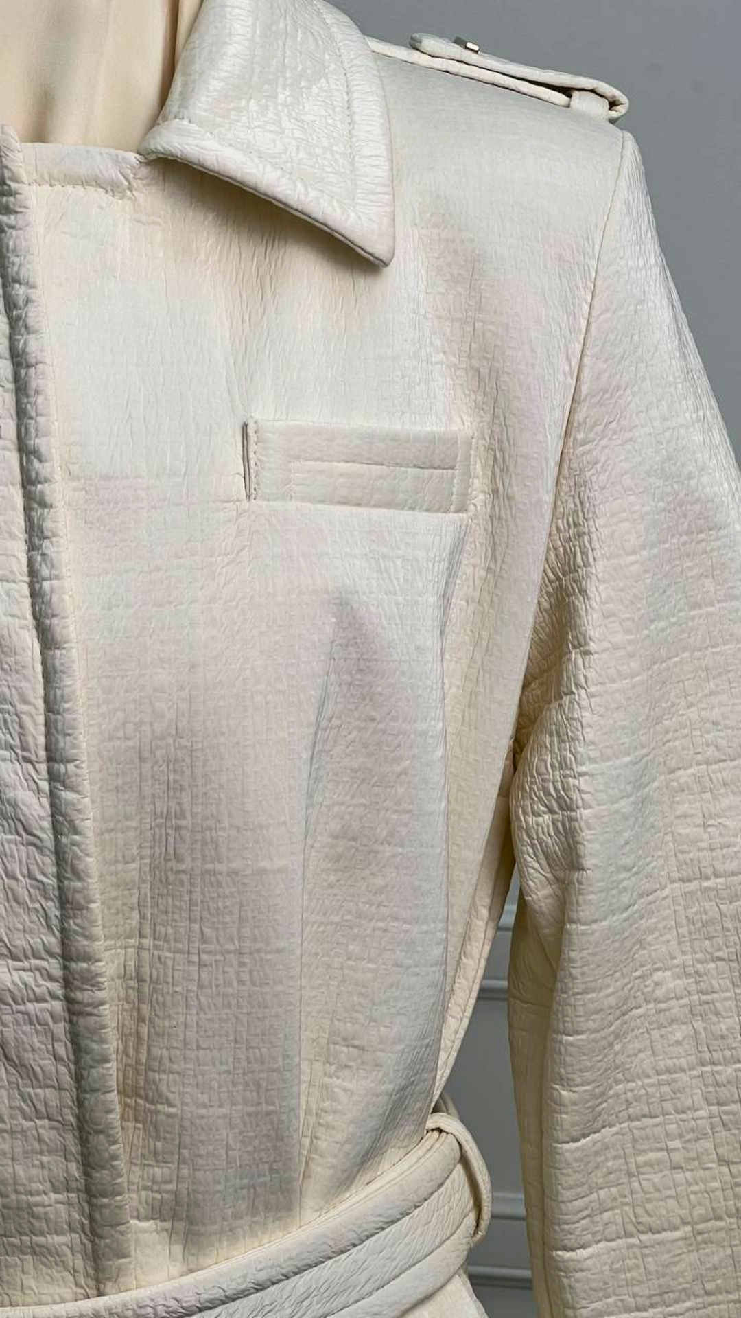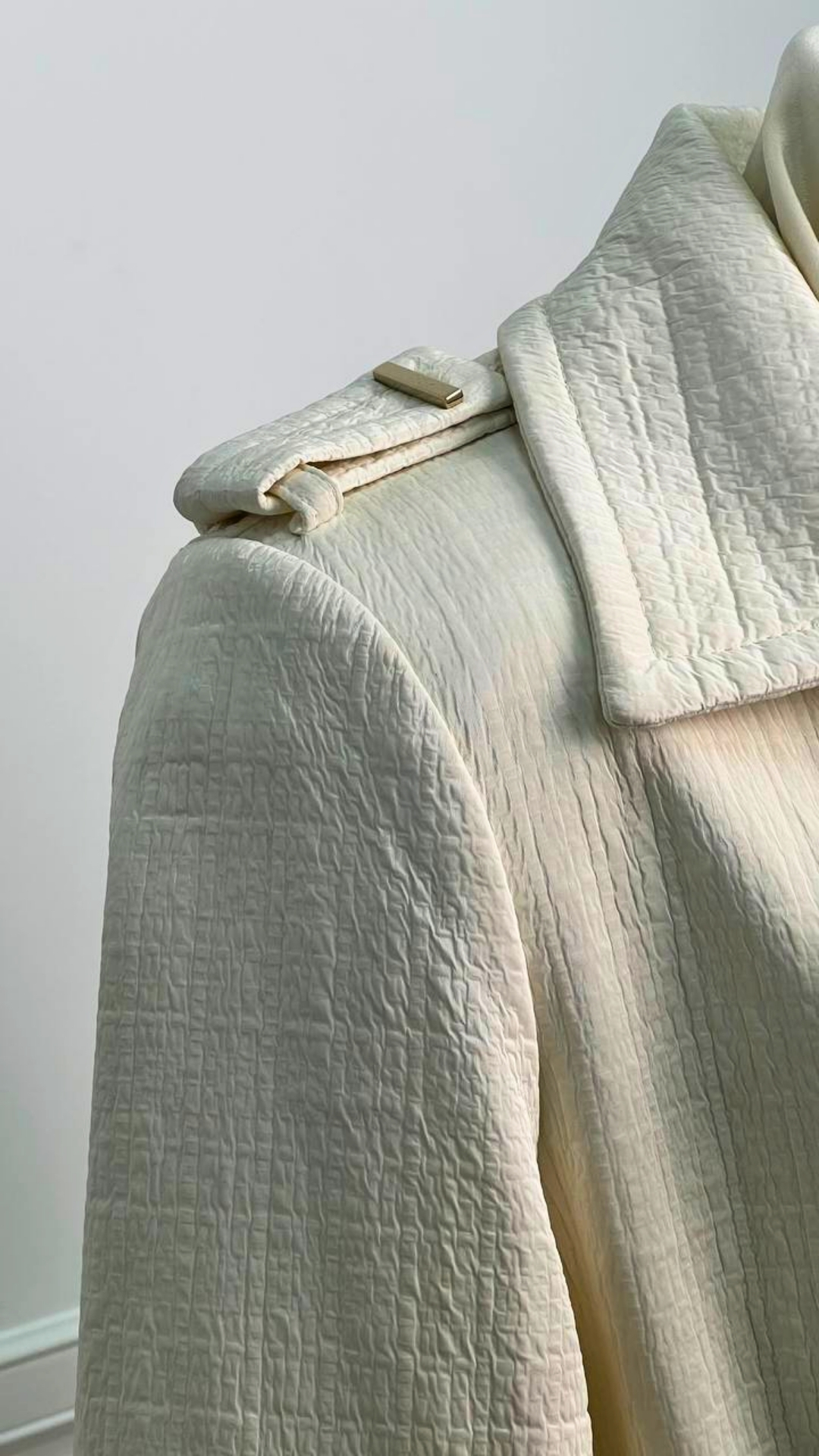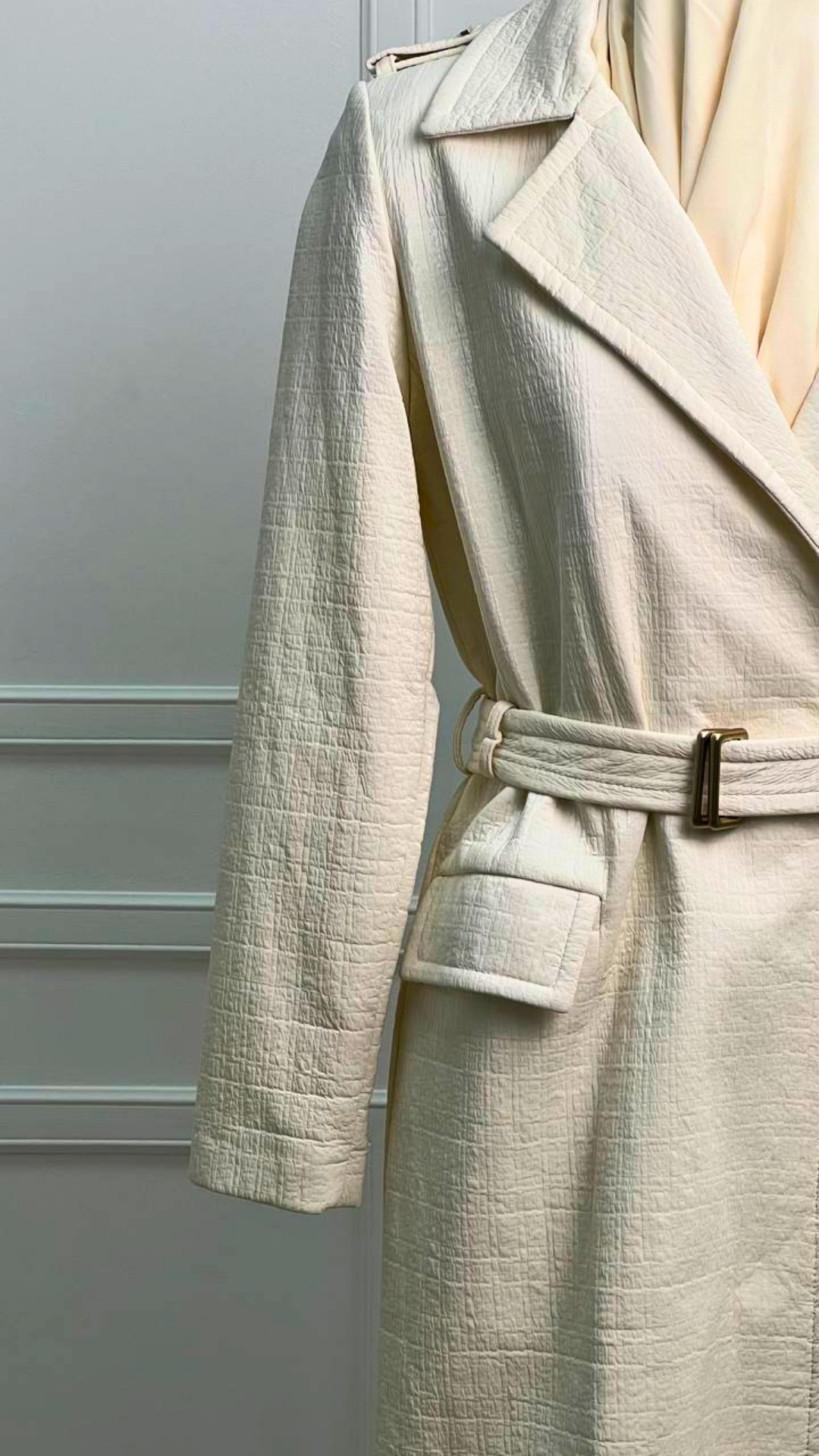 Тренч из двусторонней ткани Chanel — вещь, которая выходит за рамки сезона и трендов. Мягкий молочный оттенок и фактурное полотно создают ощущение тихой роскоши, а продуманный крой подчёркивает силуэт, не перегружая образ. Эта модель станет основой капсульного гардероба: одинаково органично смотрится с платьями, юбками и лаконичными брюками.
