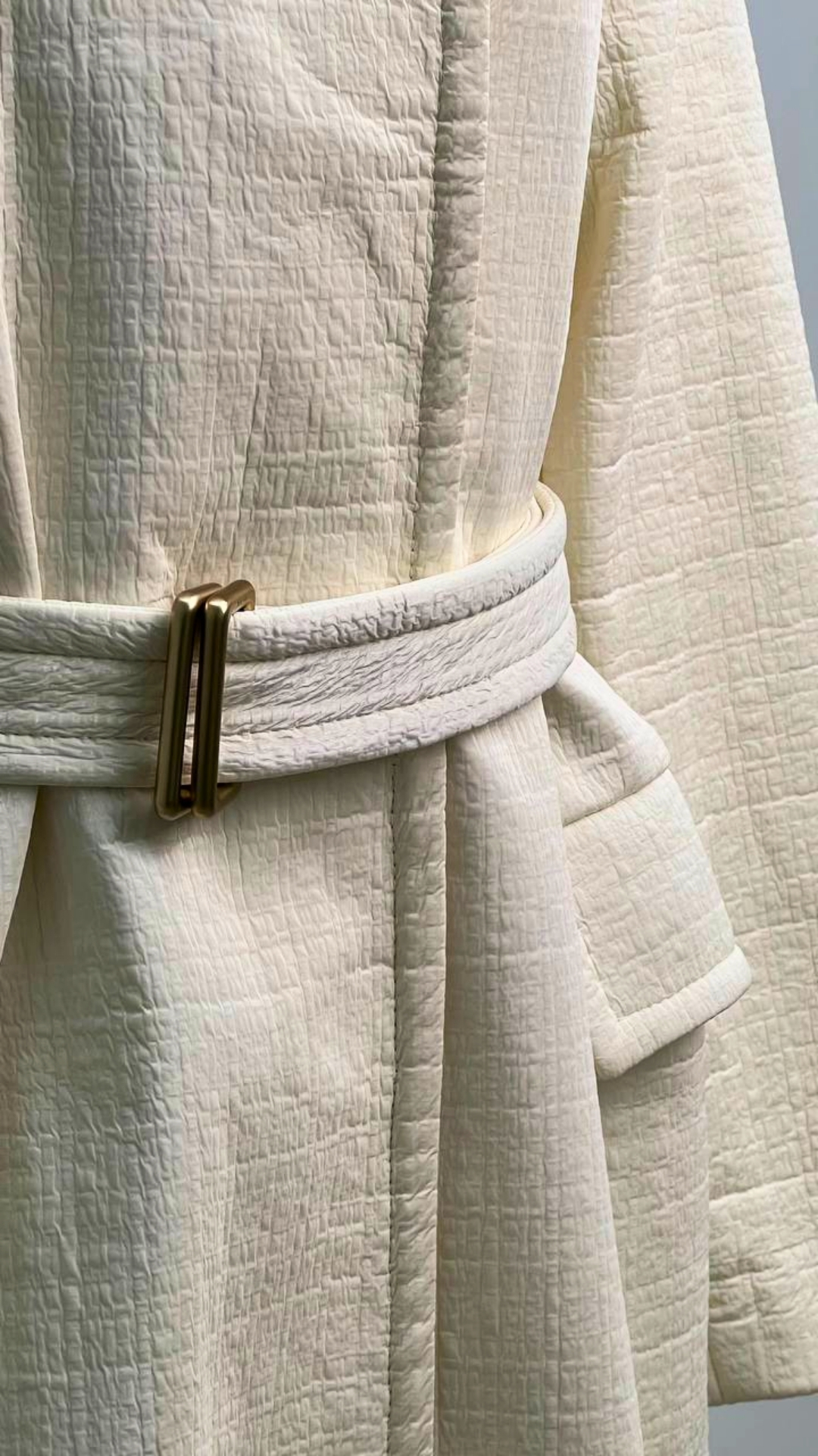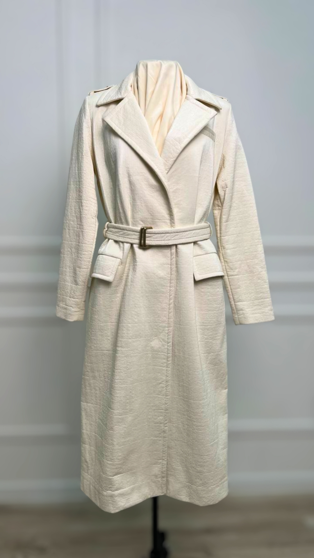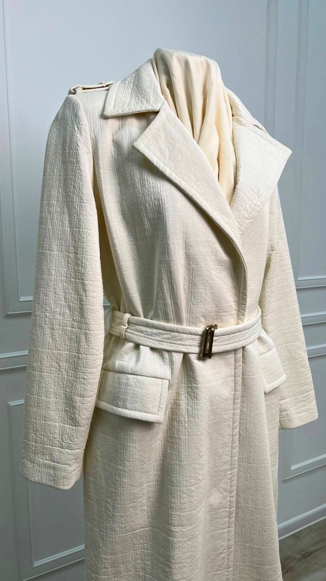 Тренч из двусторонней ткани Chanel — вещь, которая выходит за рамки сезона и трендов. Мягкий молочный оттенок и фактурное полотно создают ощущение тихой роскоши, а продуманный крой подчёркивает силуэт, не перегружая образ. Эта модель станет основой капсульного гардероба: одинаково органично смотрится с платьями, юбками и лаконичными брюками.