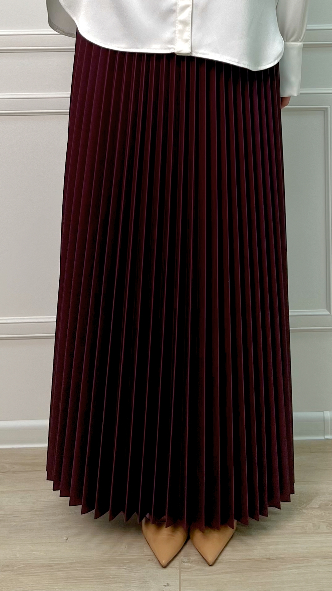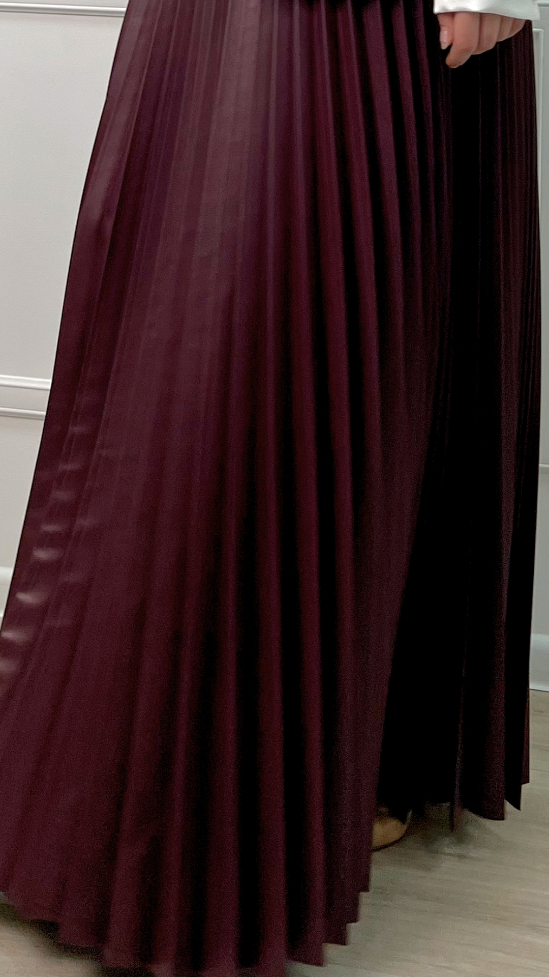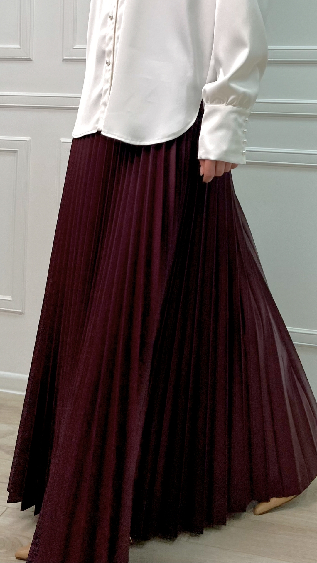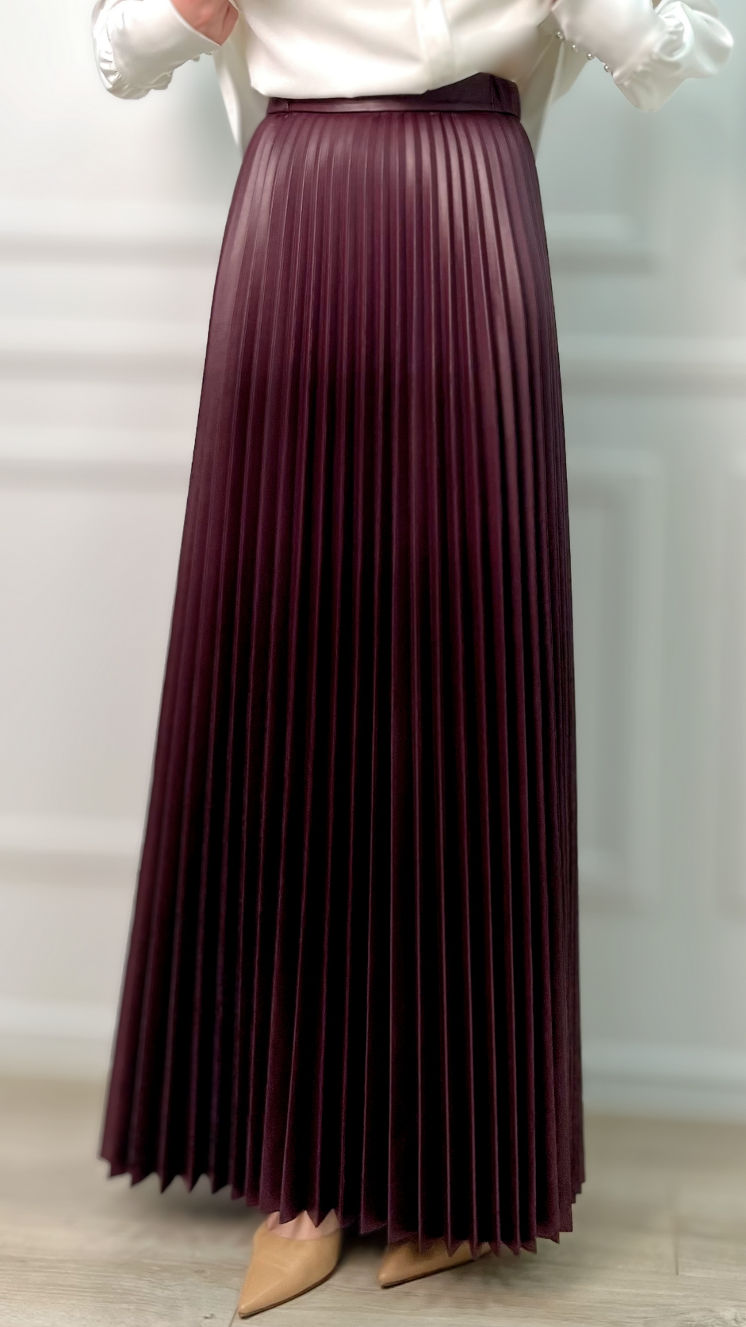 Плиссированная юбка из мягкой экокожи глубокого гранатового оттенка. Тончайшие складки красиво играют при движении, создавая ощущение лёгкости, а благородный цвет добавляет образу выразительности без лишней яркости.
